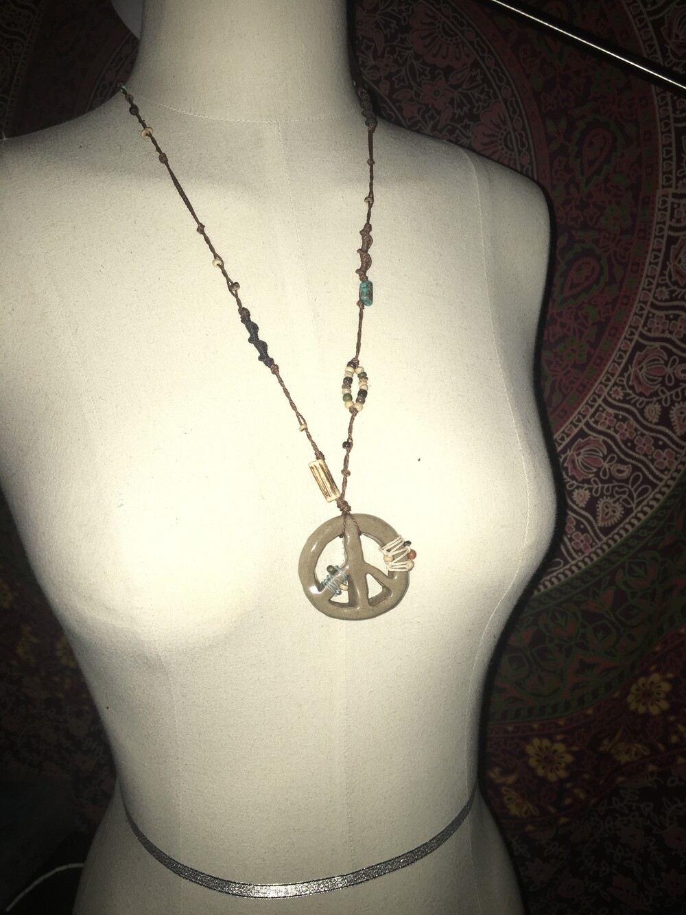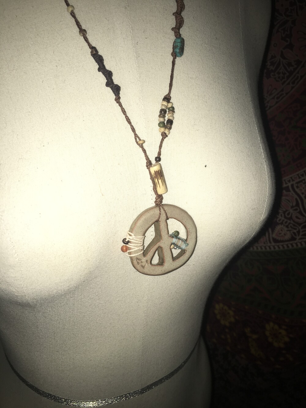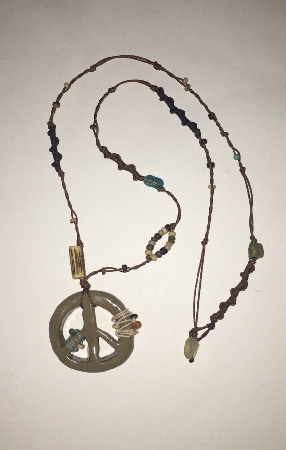 청자토로 빚은 피스 심볼 펜던트를 중심으로,끈 전체를 따라 수공예 매듭과 다양한 비즈를 이어 엮은 목걸이예요 ˖°🕊 ͗ ͗