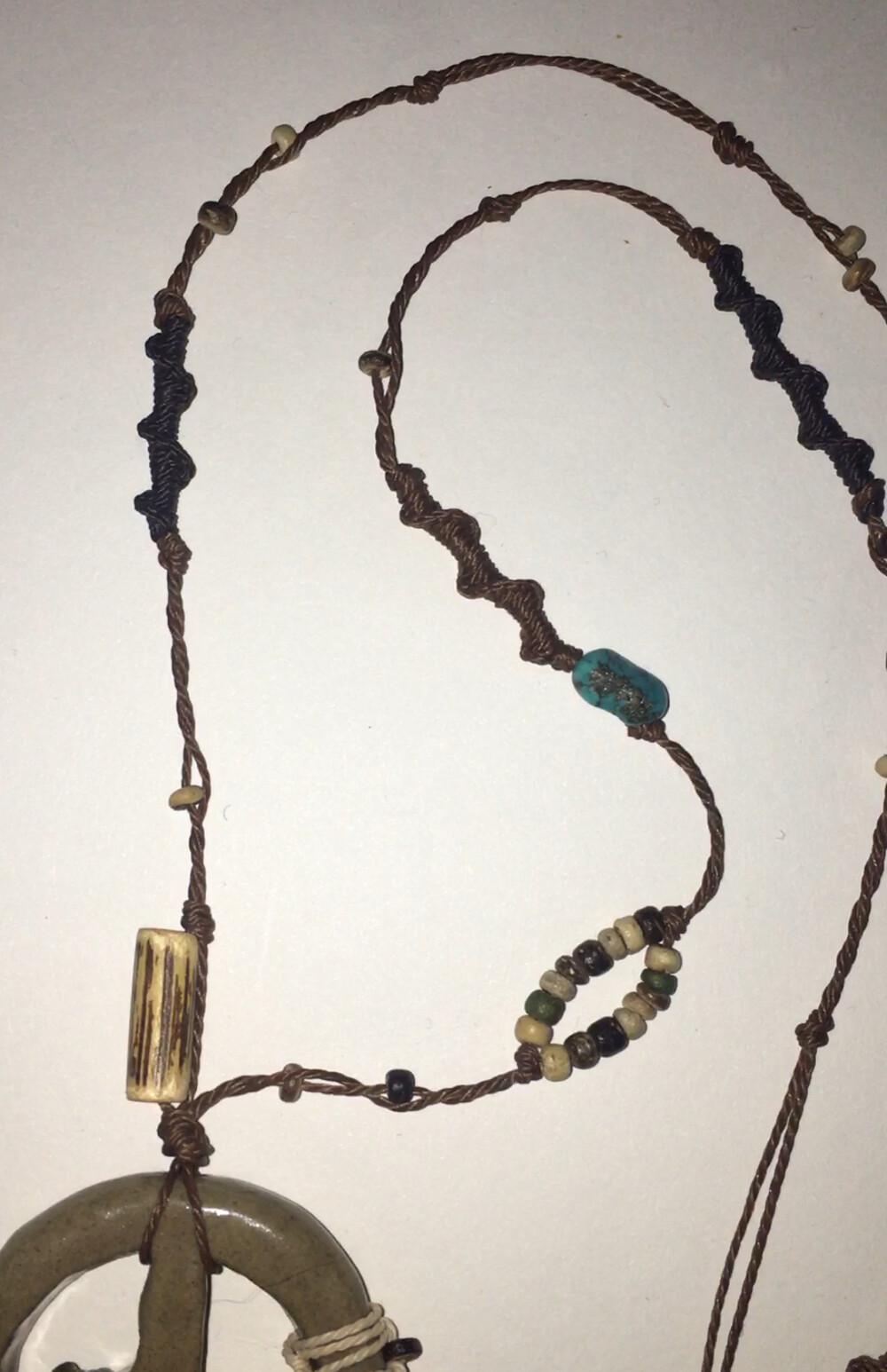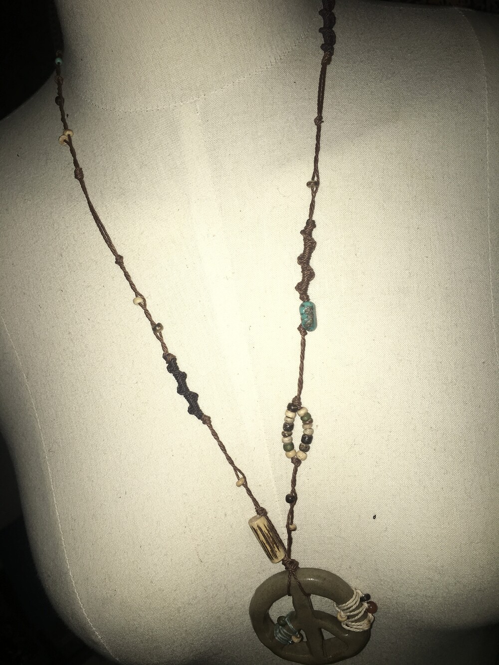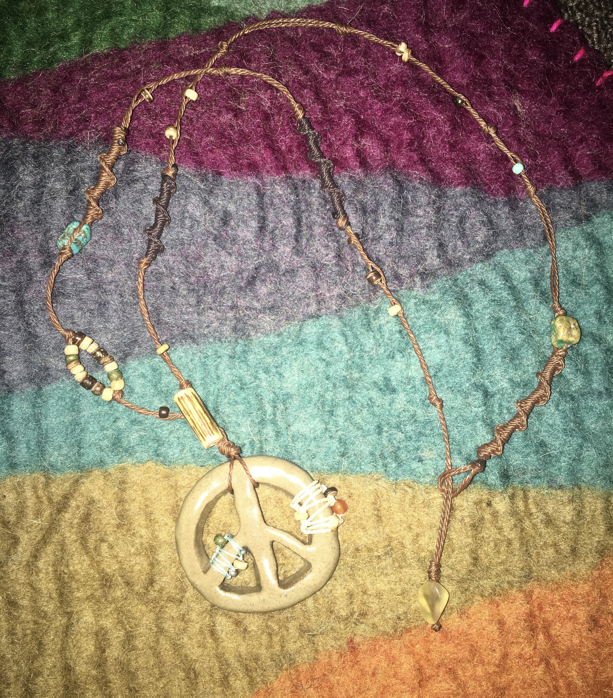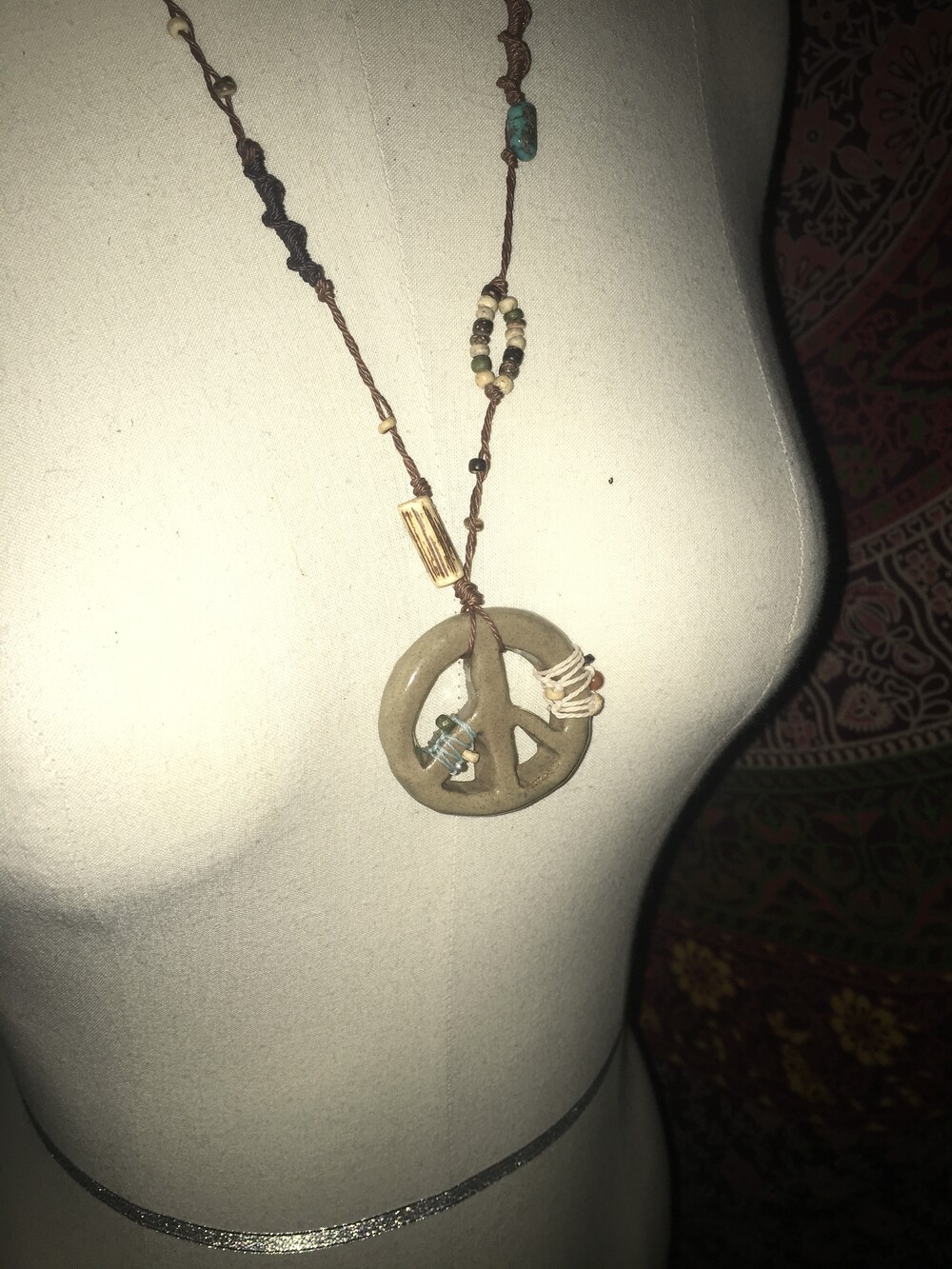 청자토로 빚은 피스 심볼 펜던트를 중심으로,끈 전체를 따라 수공예 매듭과 다양한 비즈를 이어 엮은 목걸이예요 ˖°🕊 ͗ ͗