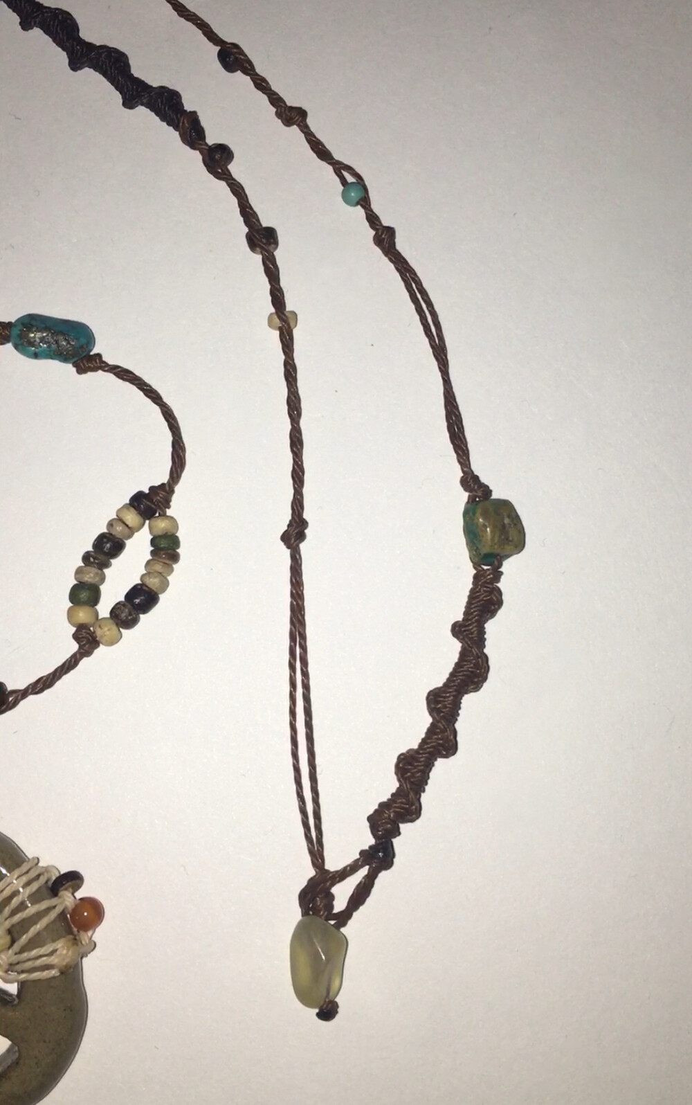 카멜계열의 꼬임끈 위에 터키석, 우드비즈, 버팔로본 비즈, 원석을 리듬감 있게 배치해