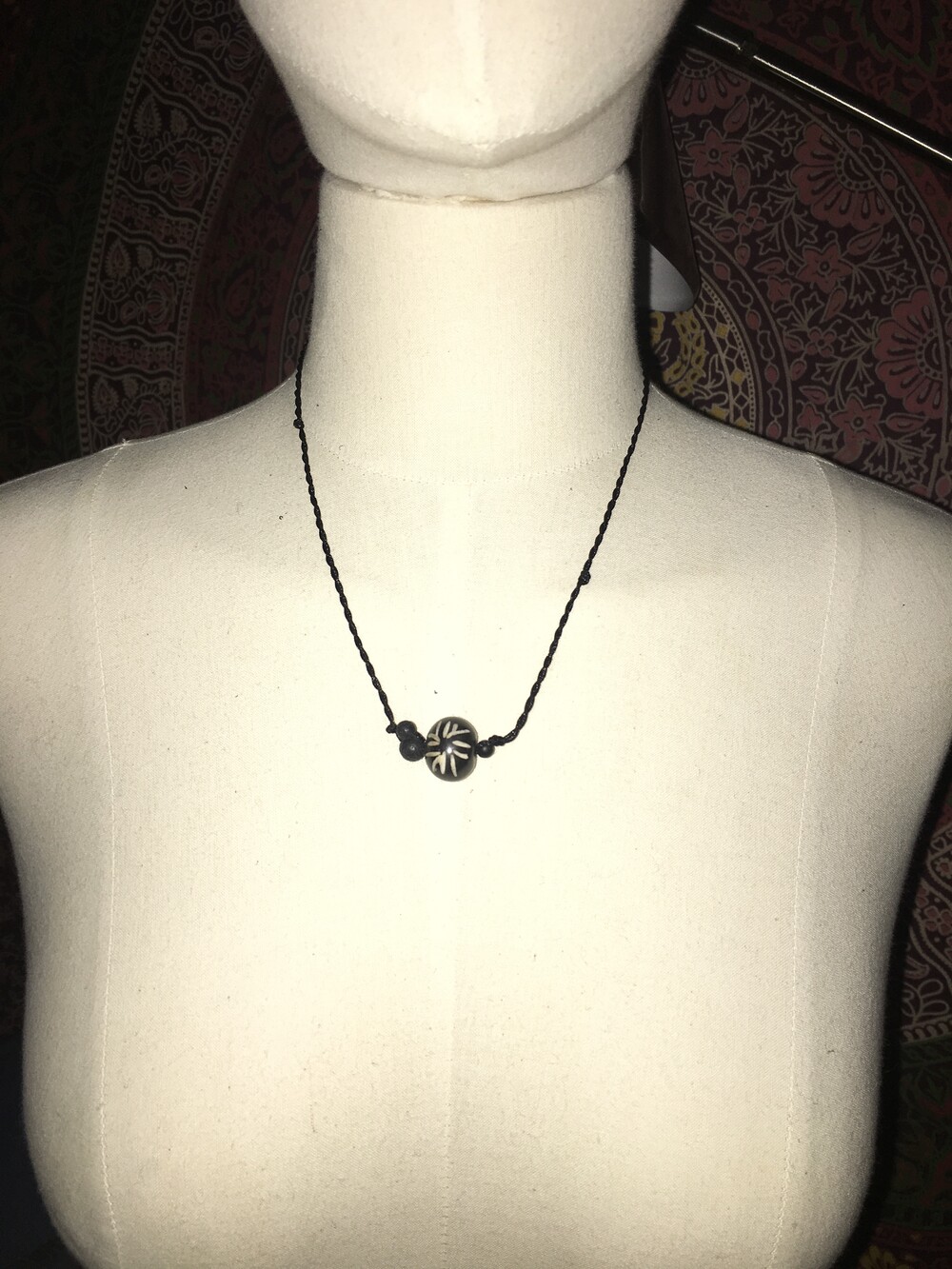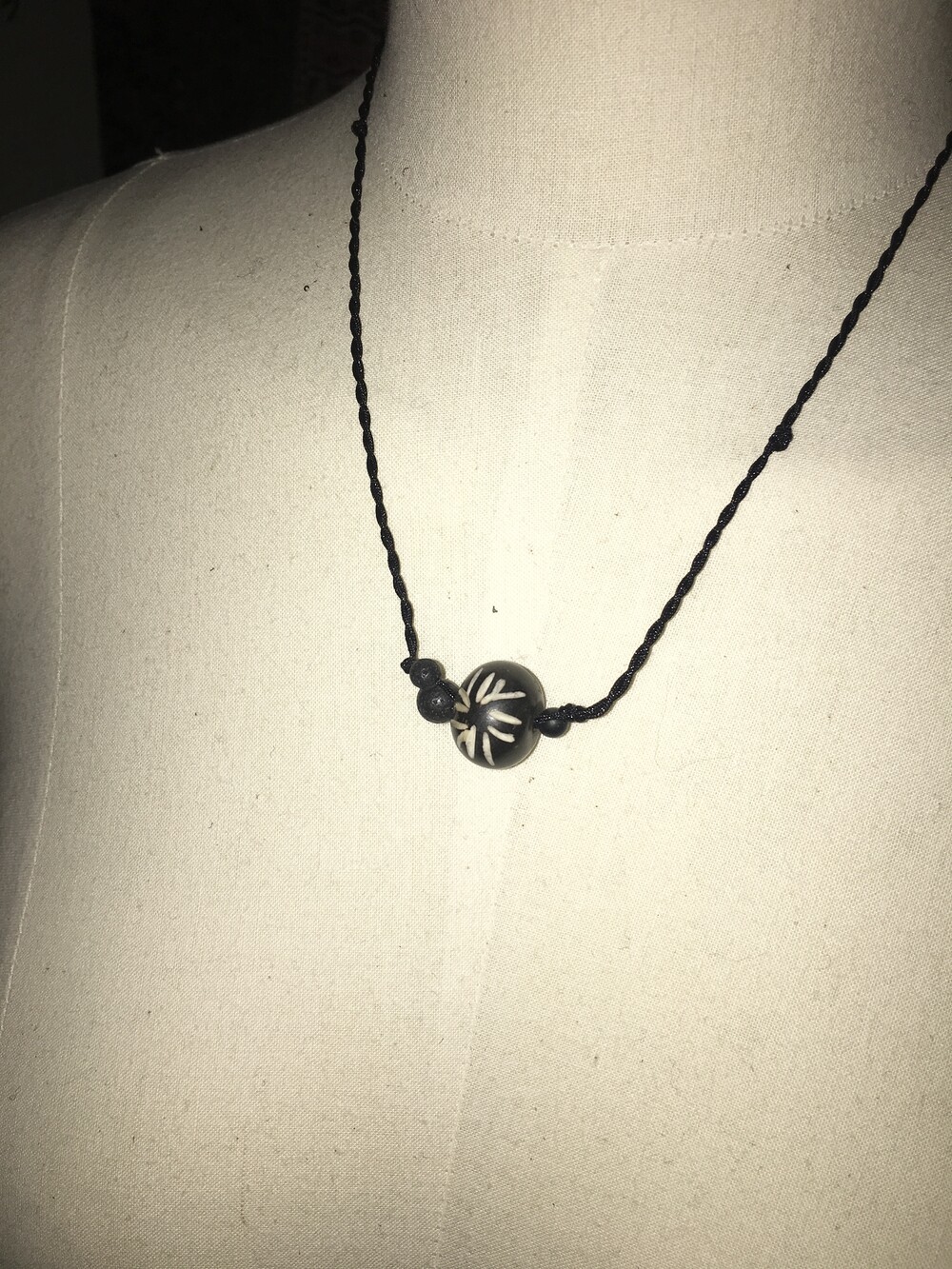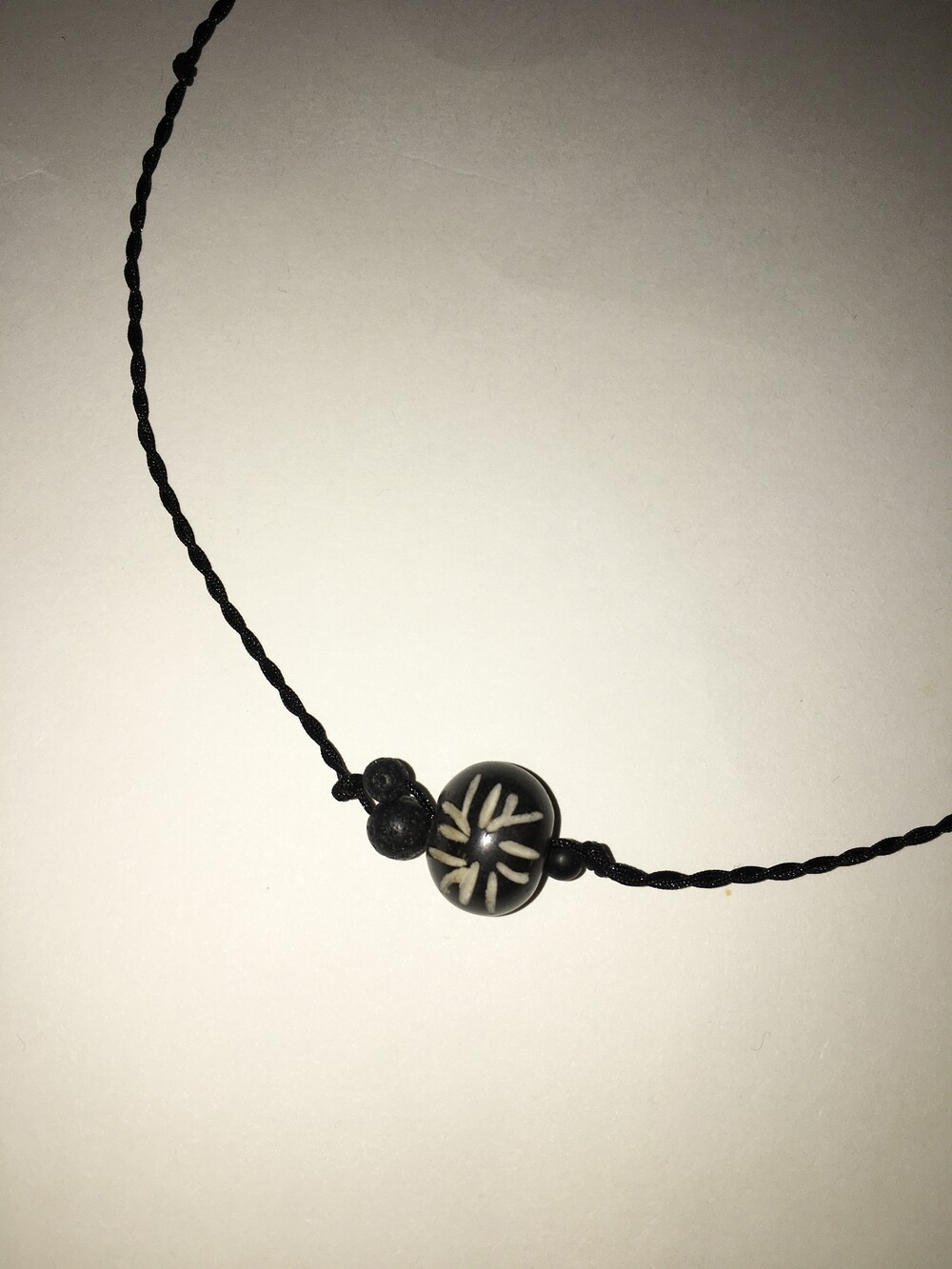 가운데에 문양이 새겨진 버팔로본 비즈를 중심으로,작은 블랙 비즈들이 리듬감 있게 배치되어 있어요!