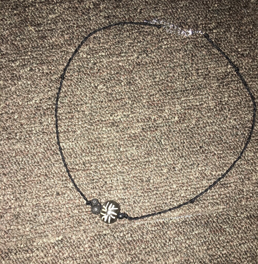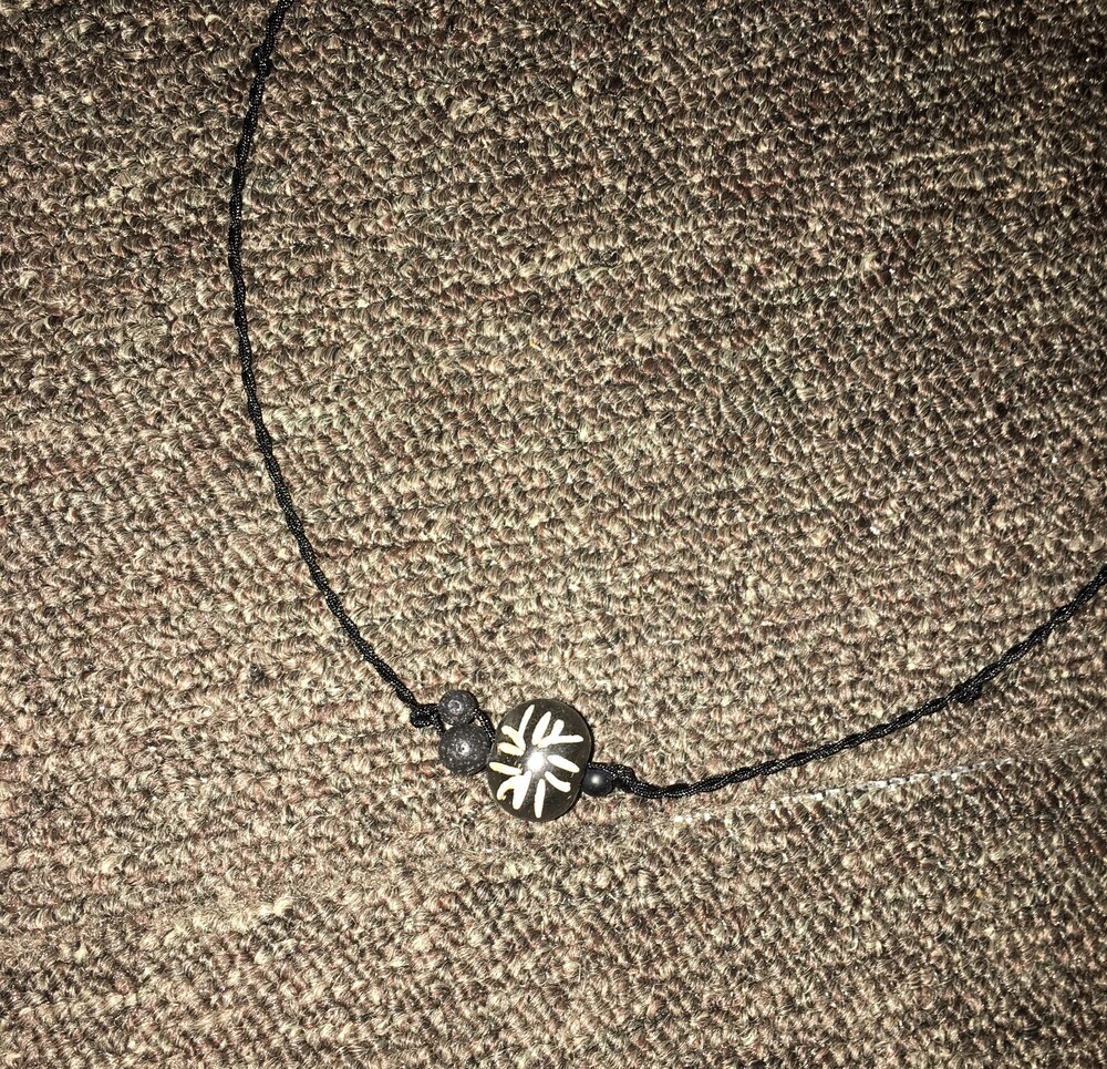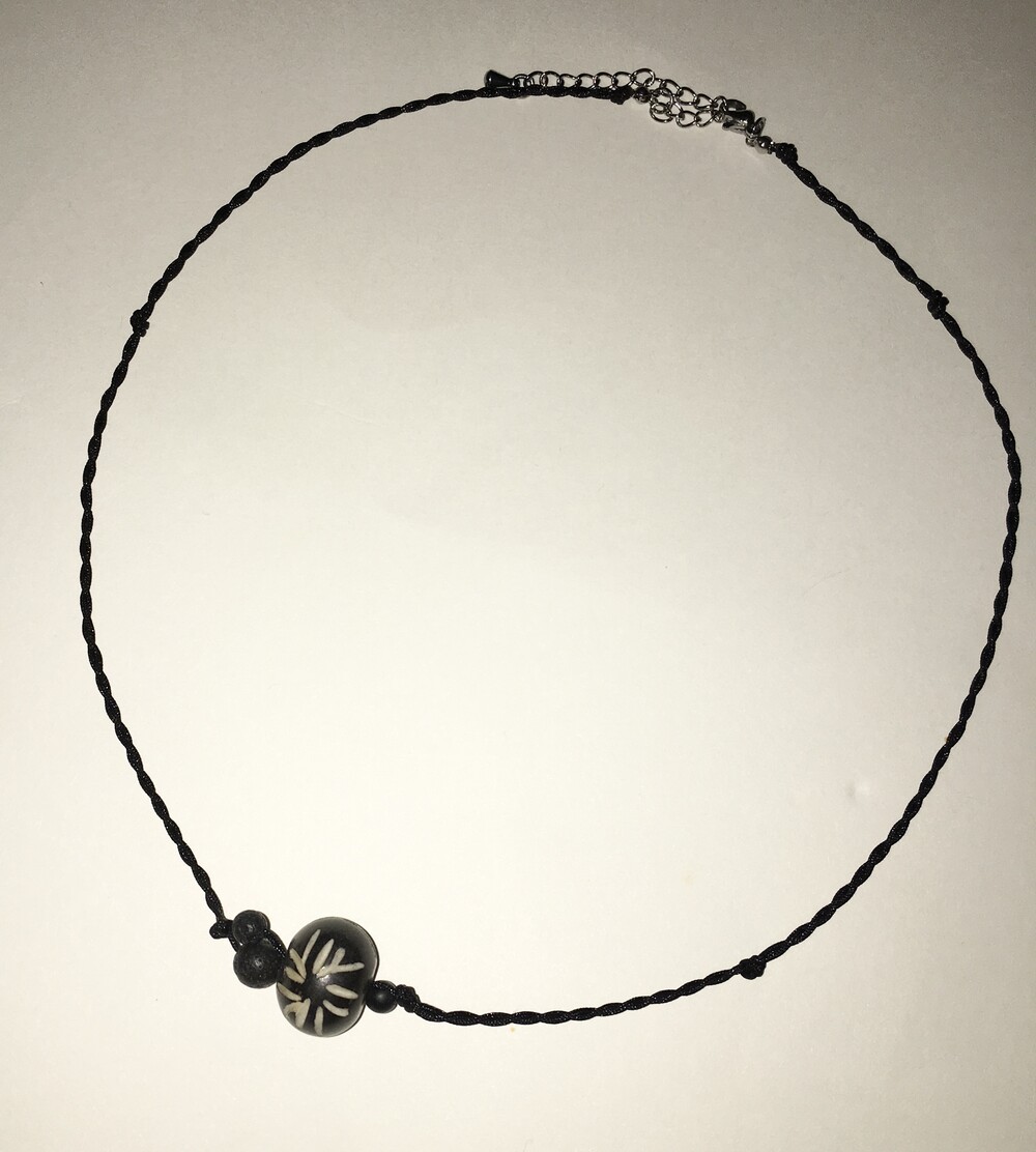 가운데에 문양이 새겨진 버팔로본 비즈를 중심으로,작은 블랙 비즈들이 리듬감 있게 배치되어 있어요!