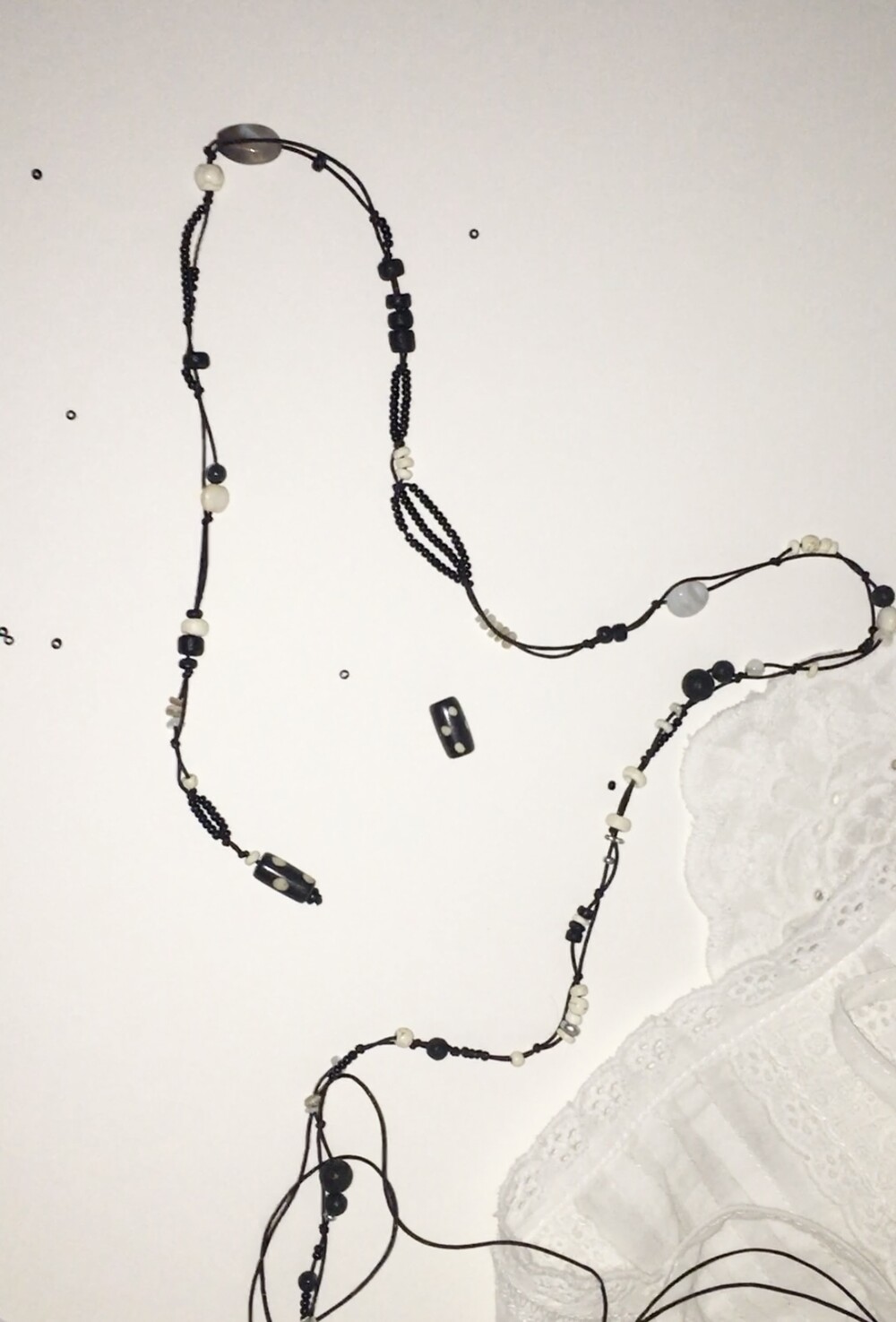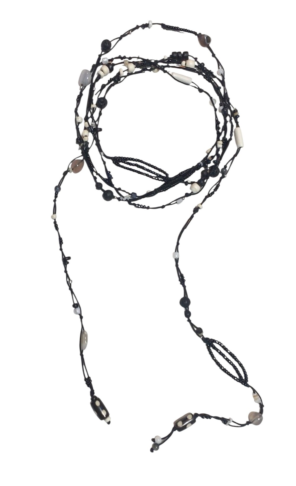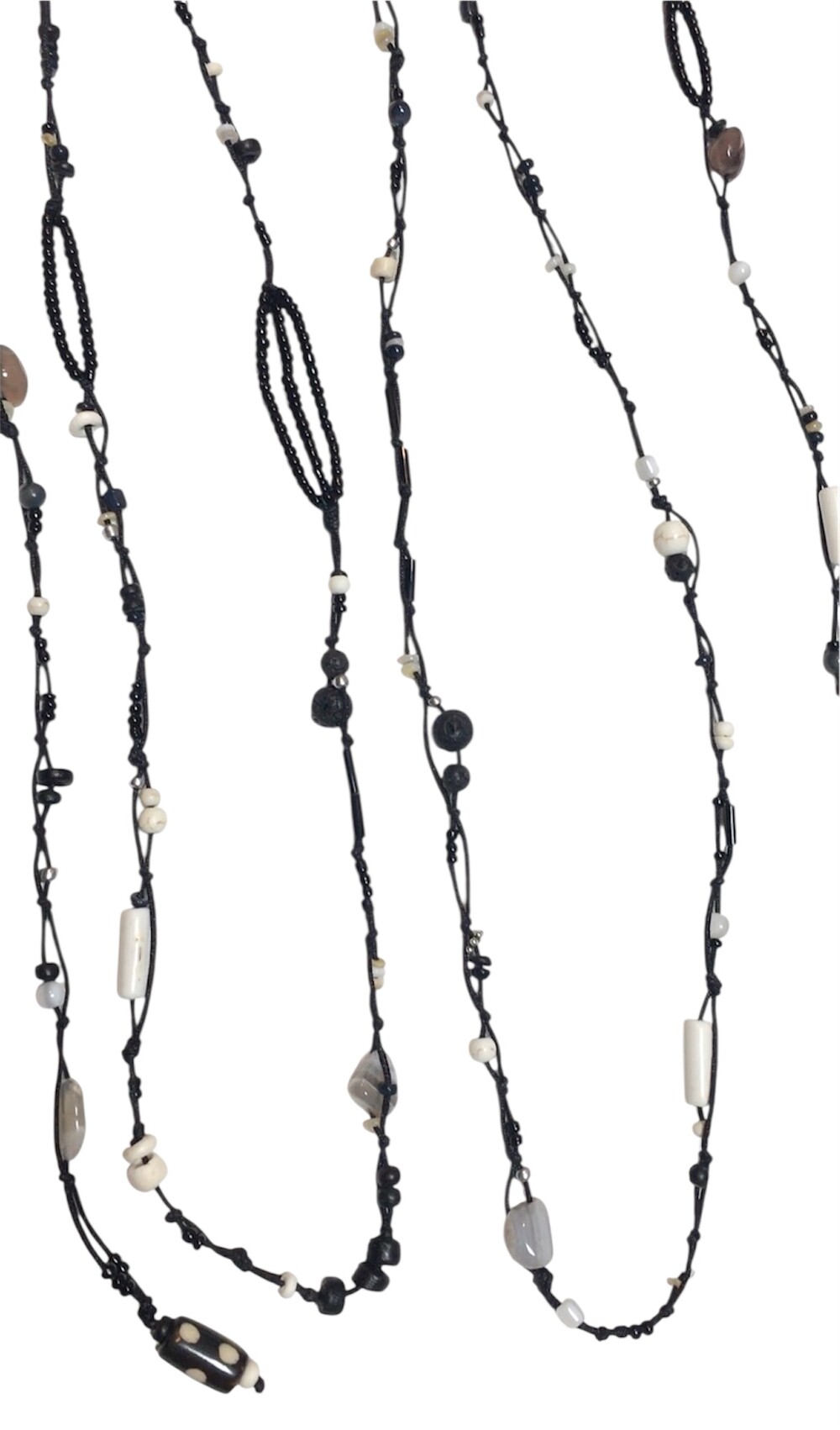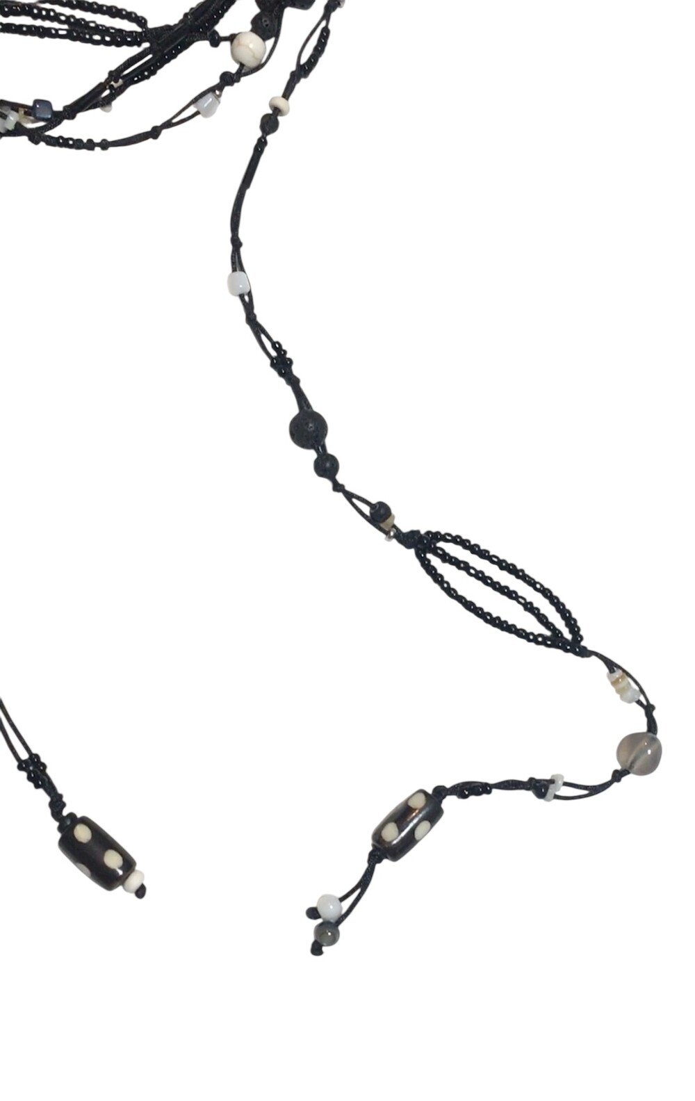 블랙 컬러의 얇은 실 위로 흑백의 작은 점들이 조약돌처럼 콕콕 놓여 있는 체인이에요.•.
