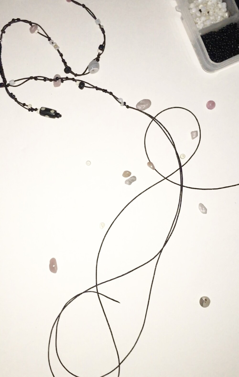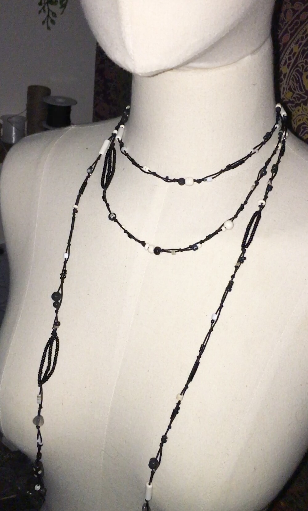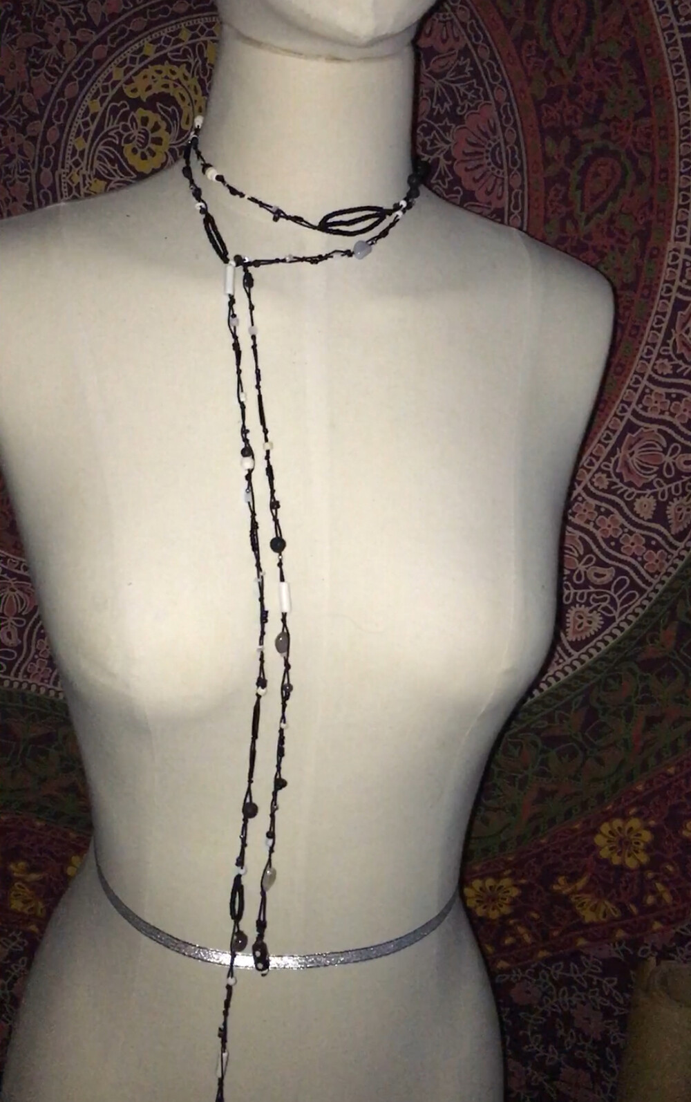 블랙 컬러의 얇은 실 위로 흑백의 작은 점들이 조약돌처럼 콕콕 놓여 있는 체인이에요.•.