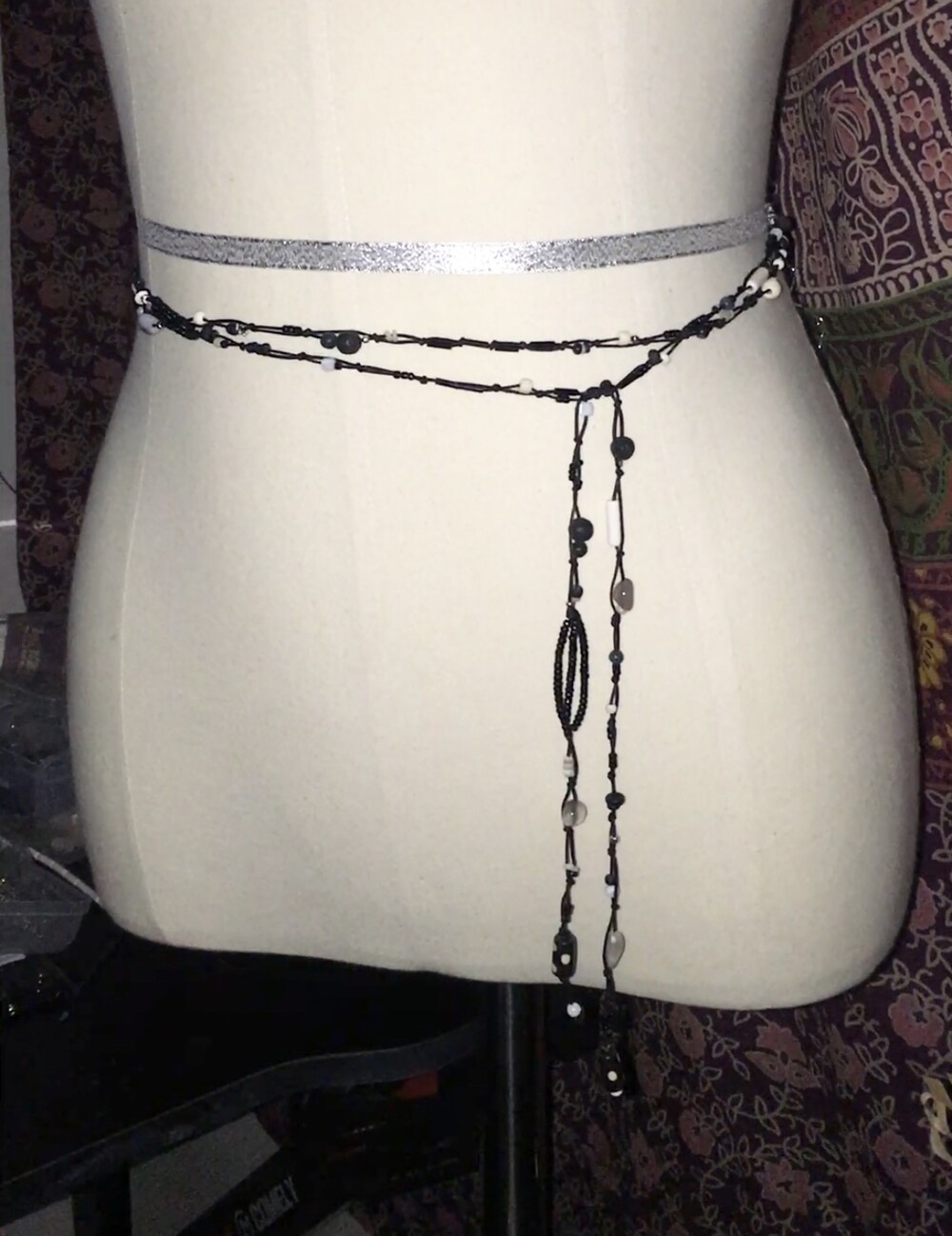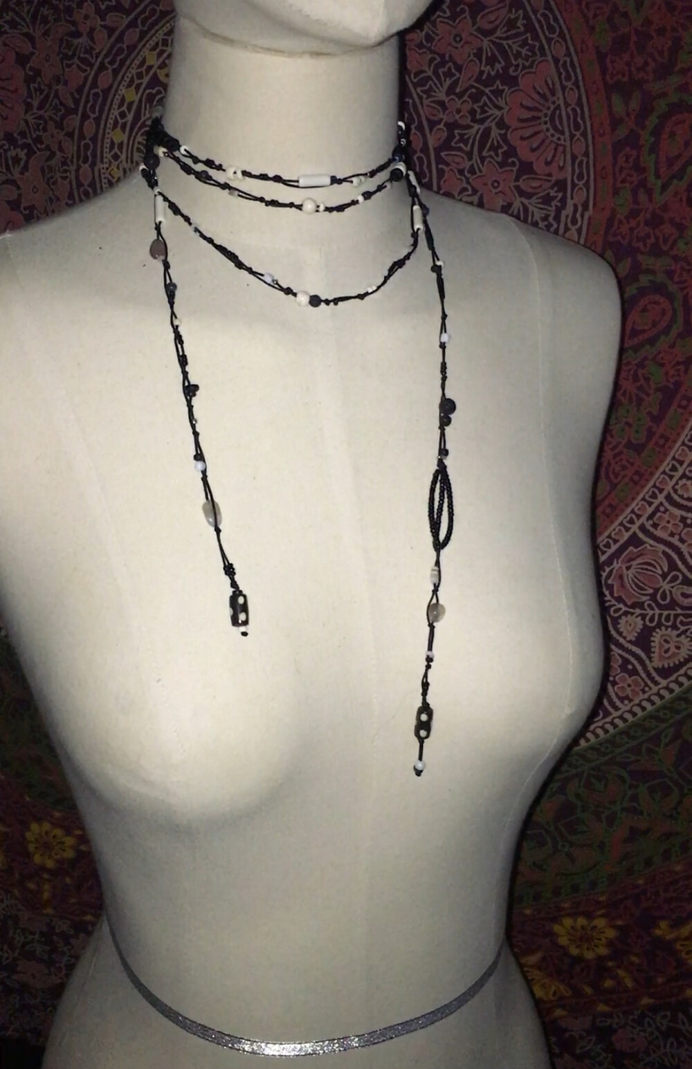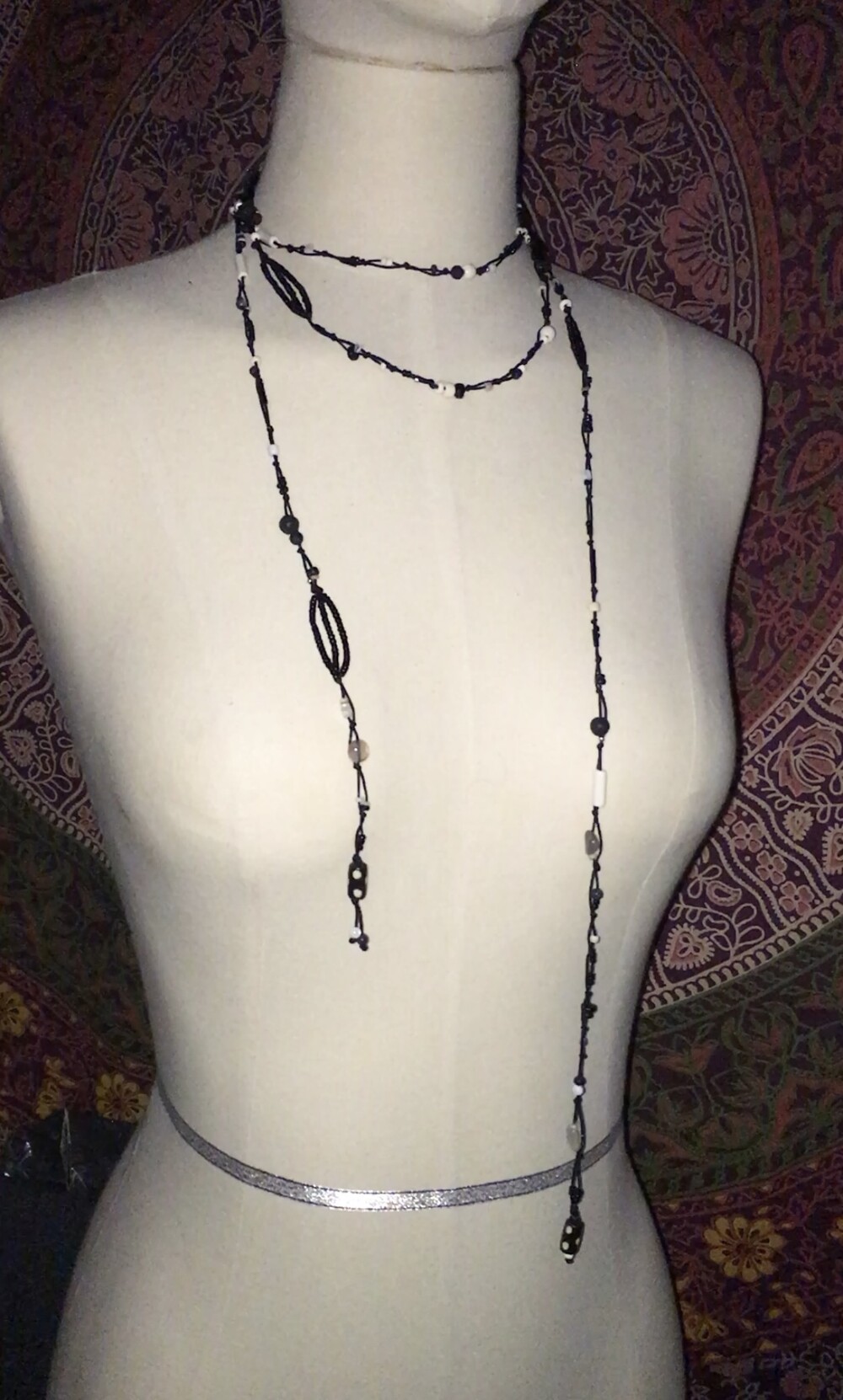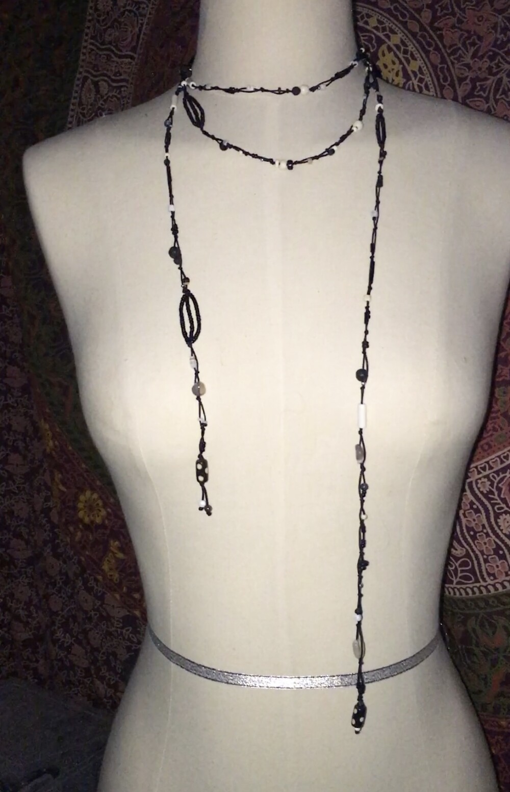 블랙 컬러의 얇은 실 위로 흑백의 작은 점들이 조약돌처럼 콕콕 놓여 있는 체인이에요.•.