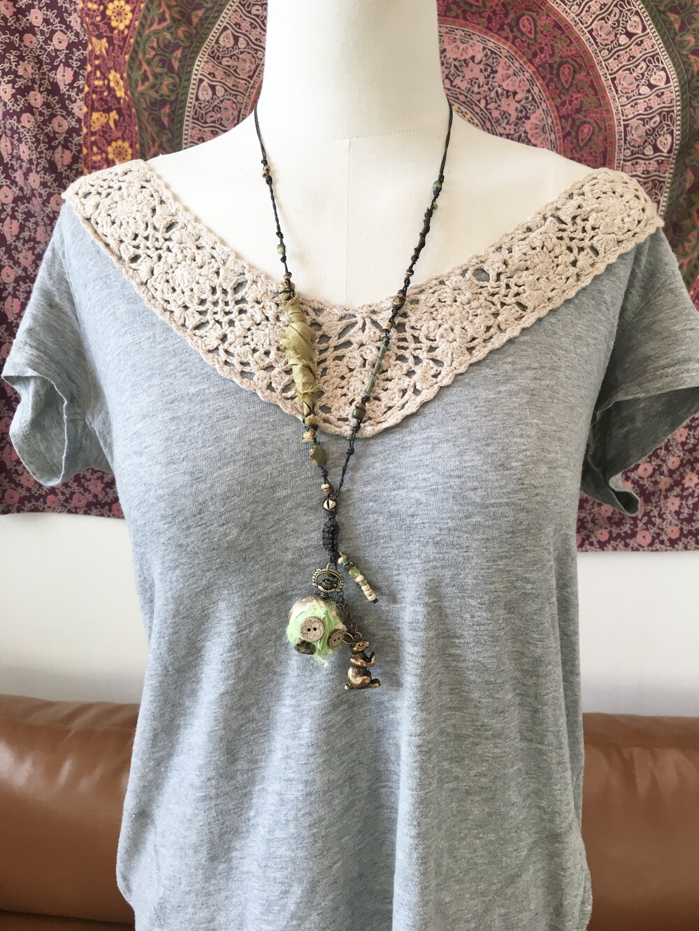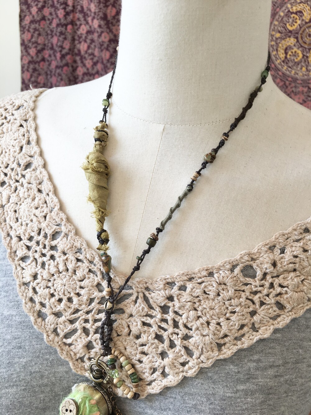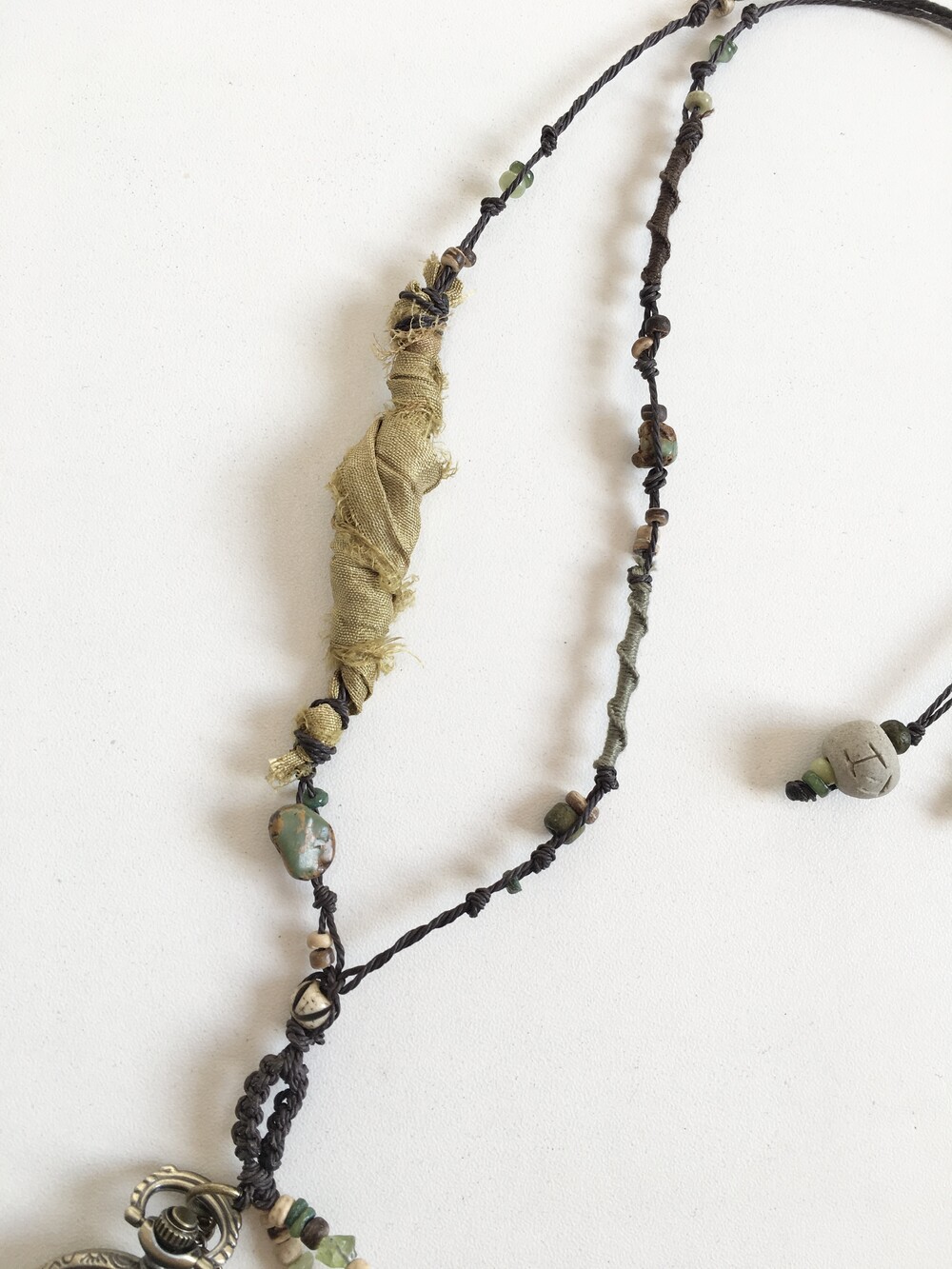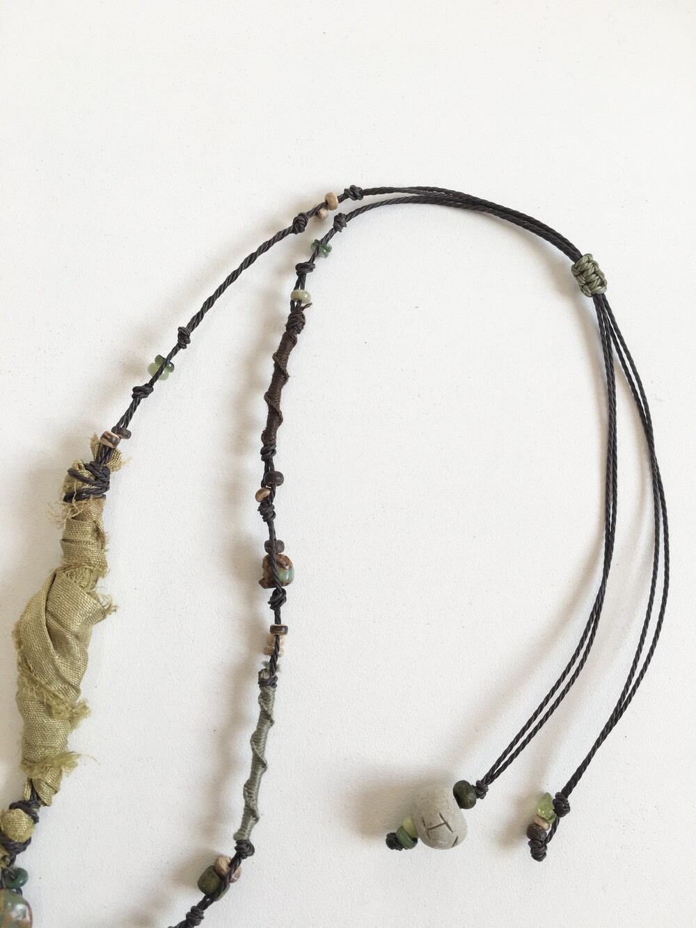 목걸이 라인에는 우드 비즈와 내추럴한 비즈들,그리고 사리실크와 실을 엮어