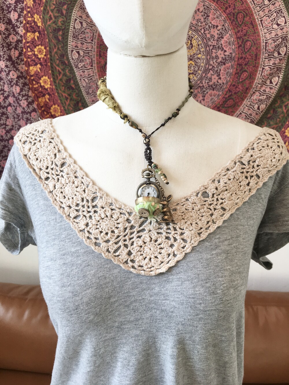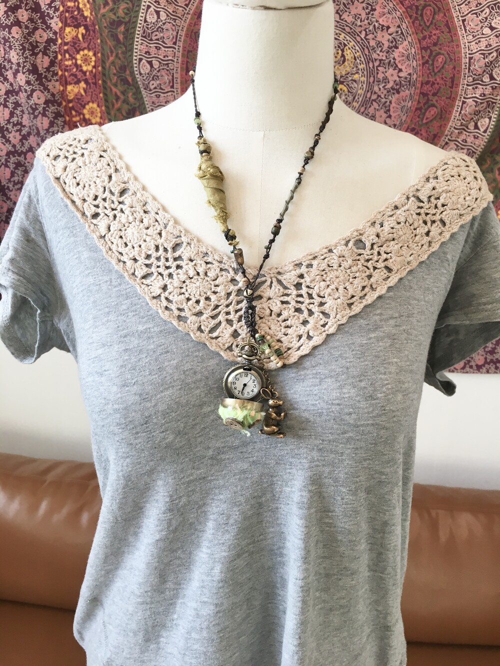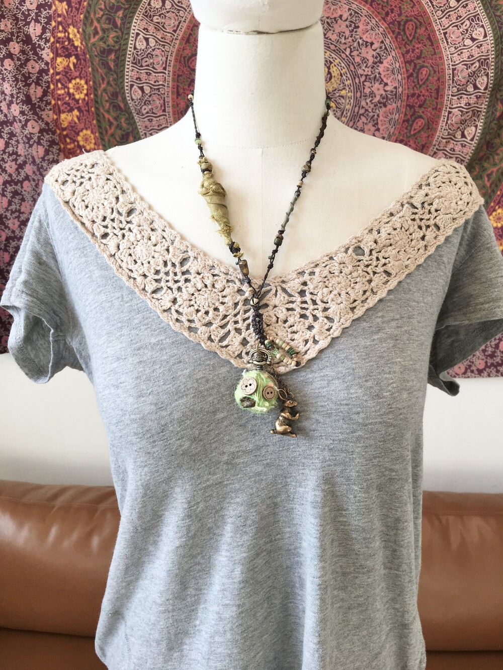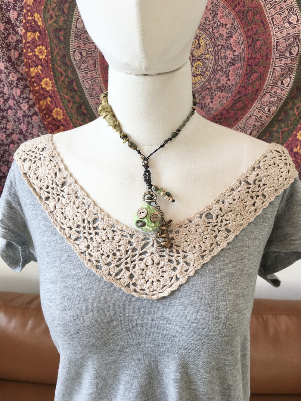 목걸이 라인에는 우드 비즈와 내추럴한 비즈들,그리고 사리실크와 실을 엮어