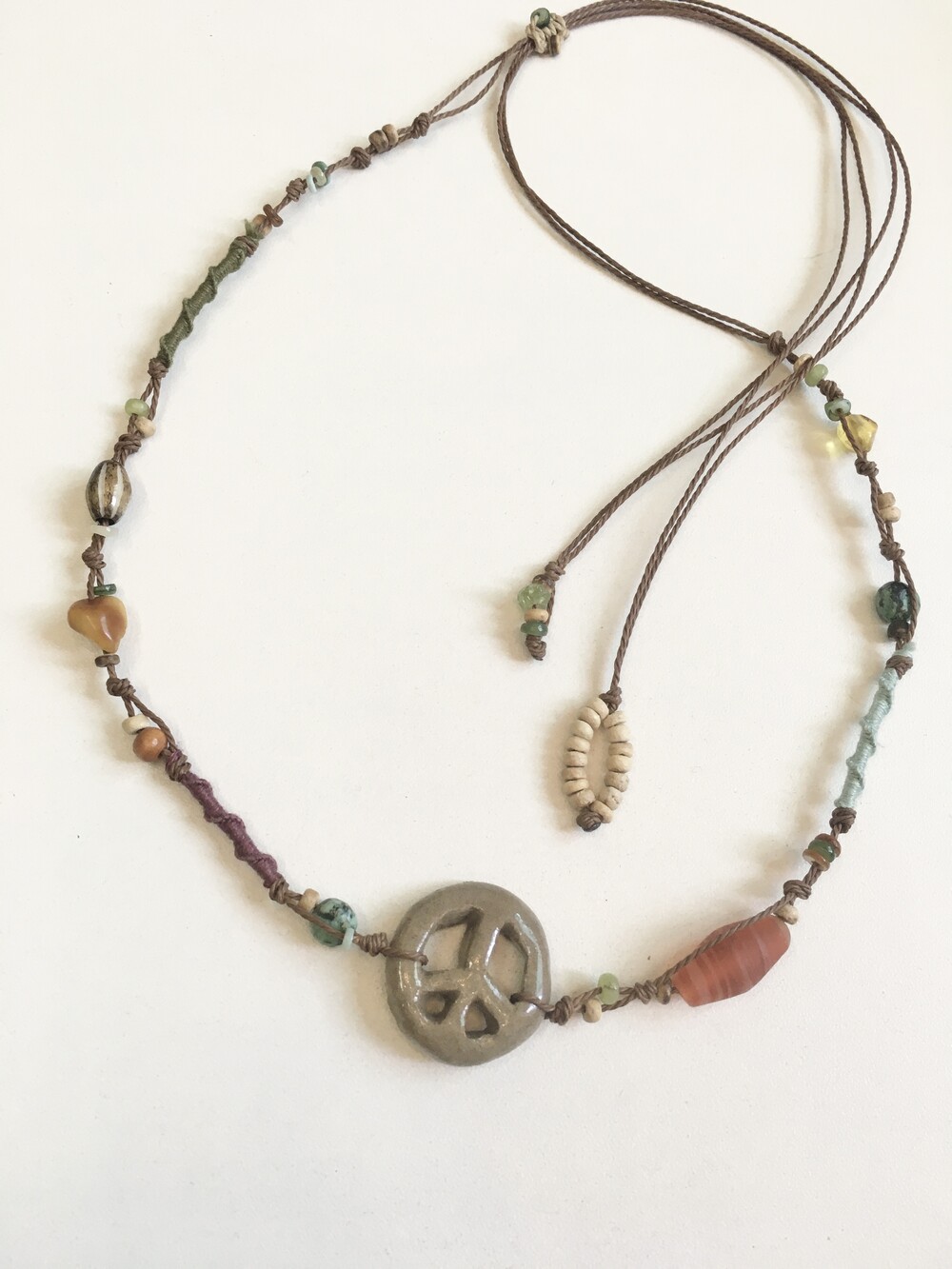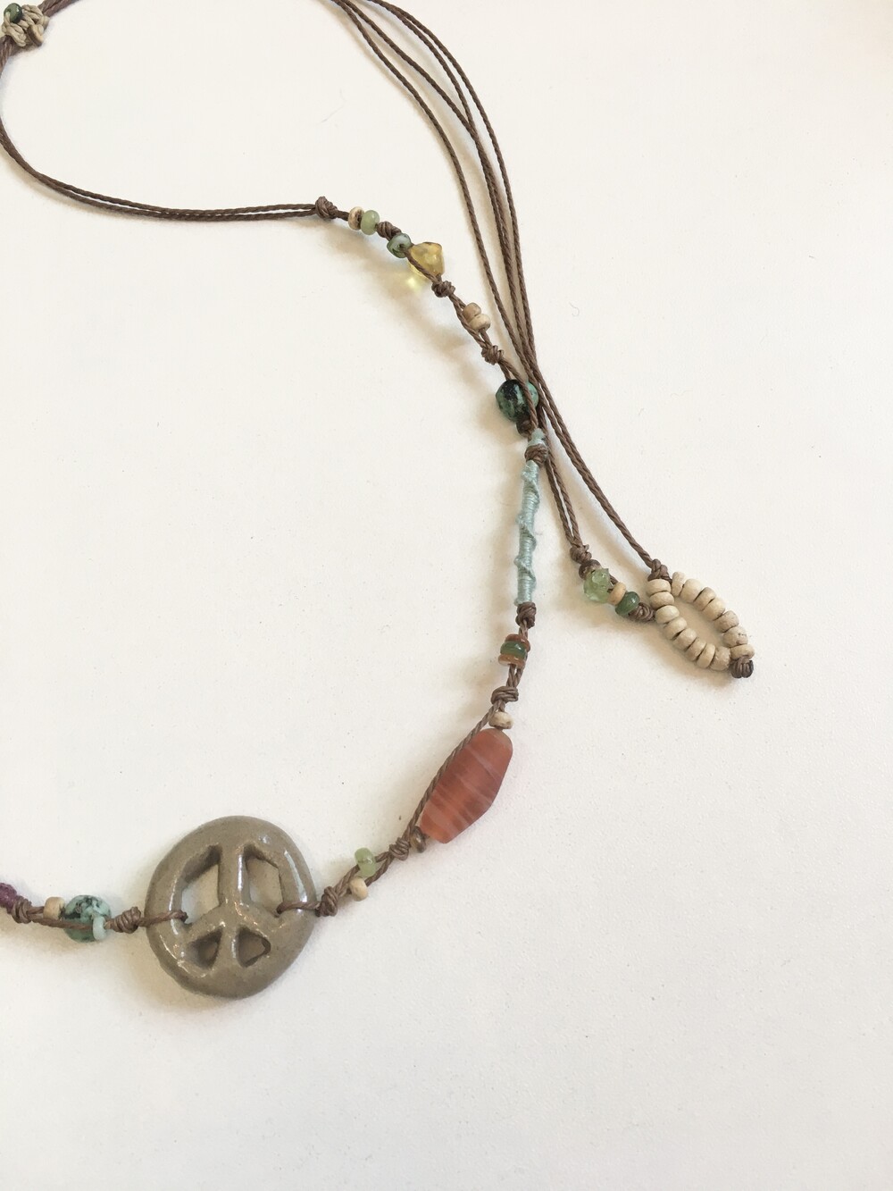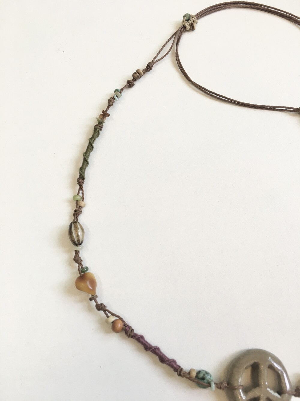 차분한 흙빛의 세라믹 팬던트에 평화를 상징하는 ☮️ 심볼을 담아