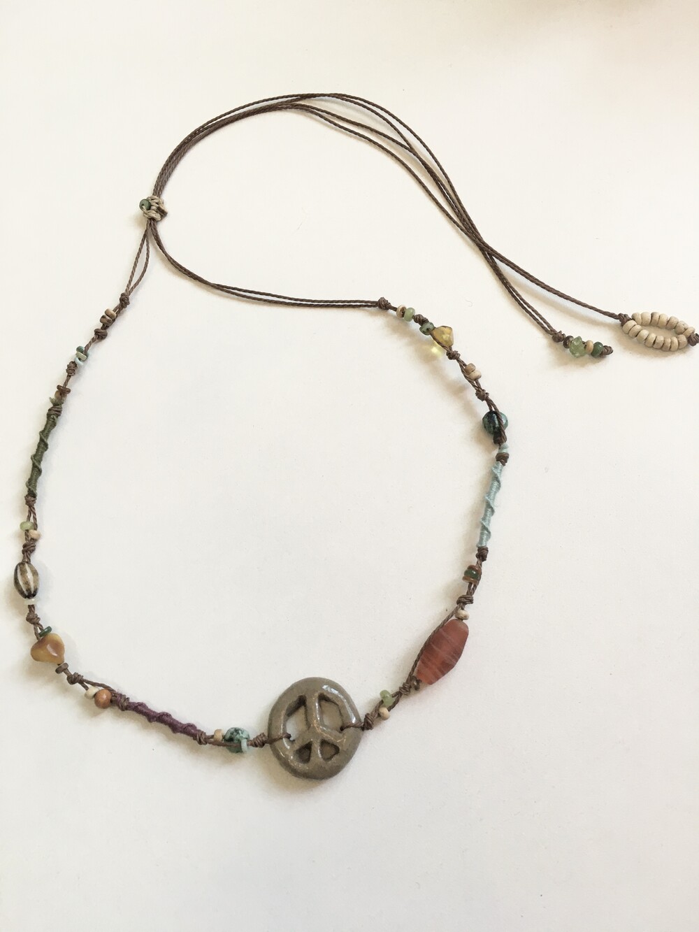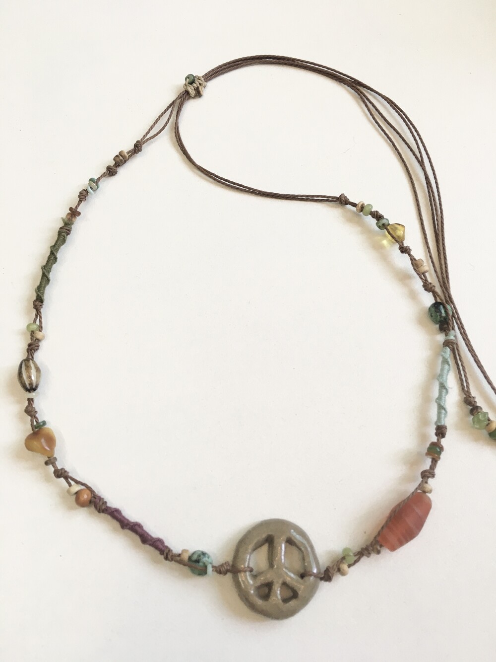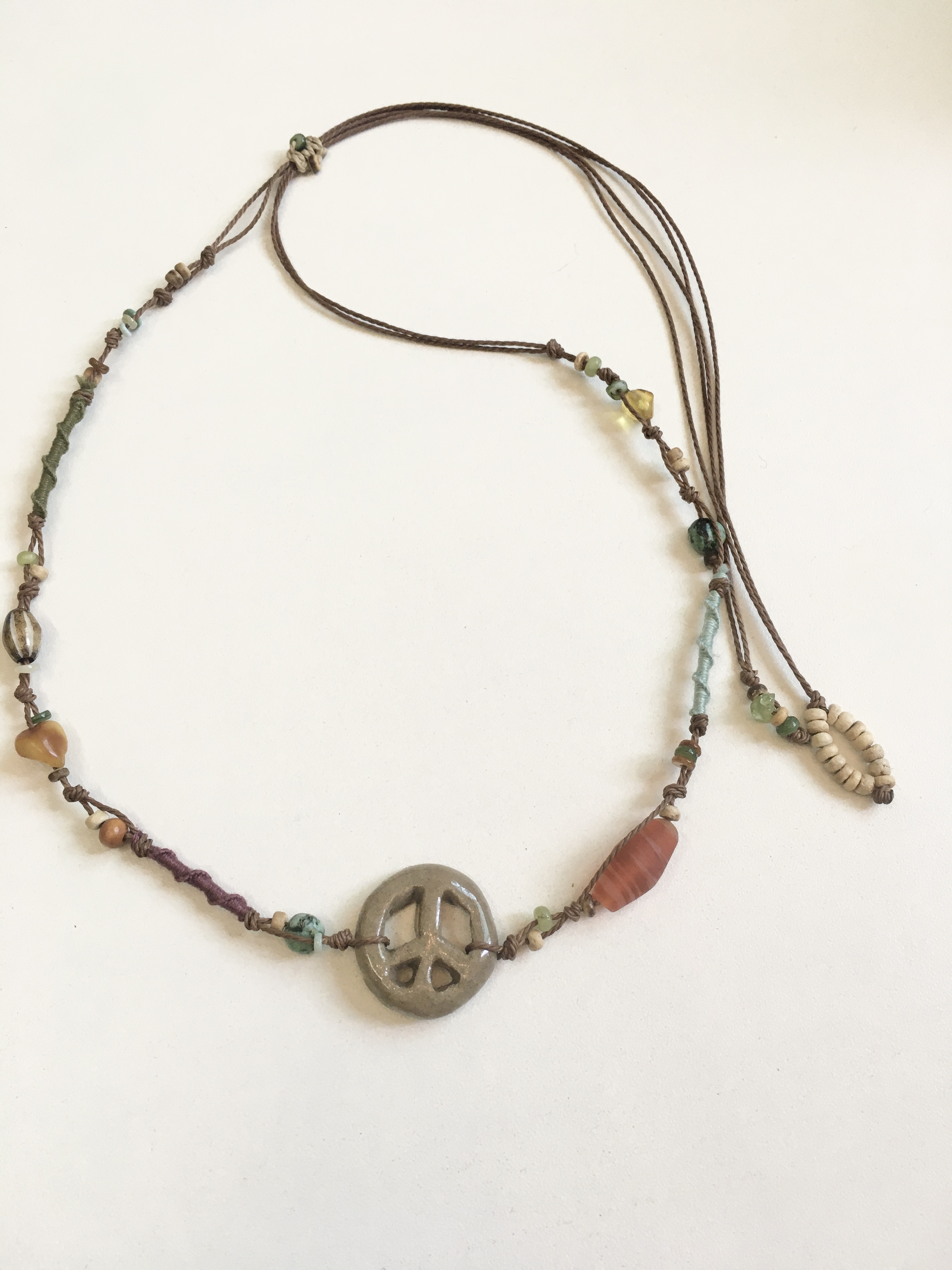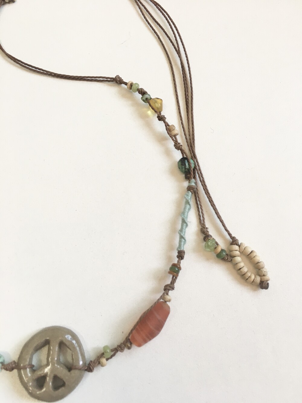 차분한 흙빛의 세라믹 팬던트에 평화를 상징하는 ☮️ 심볼을 담아