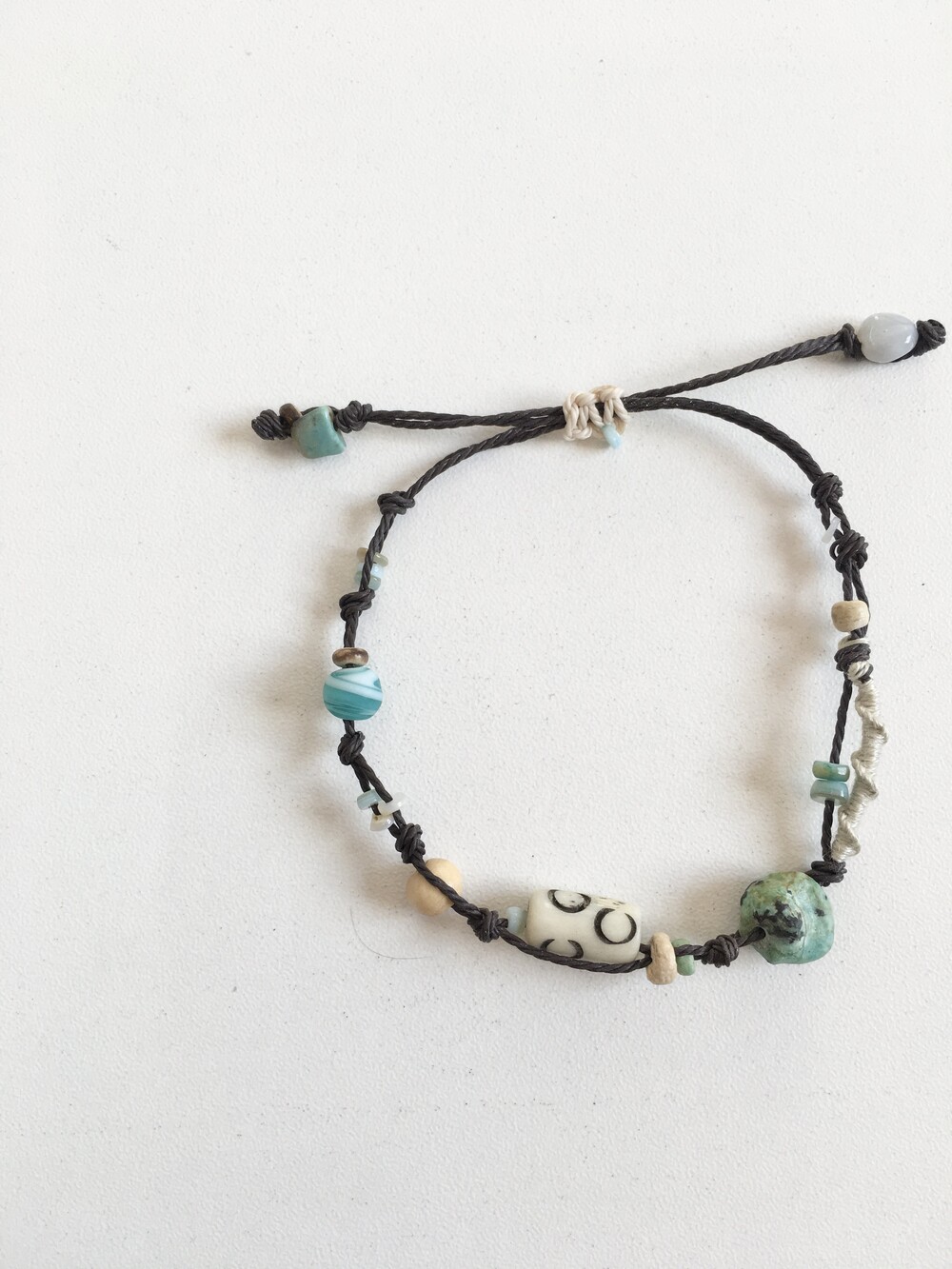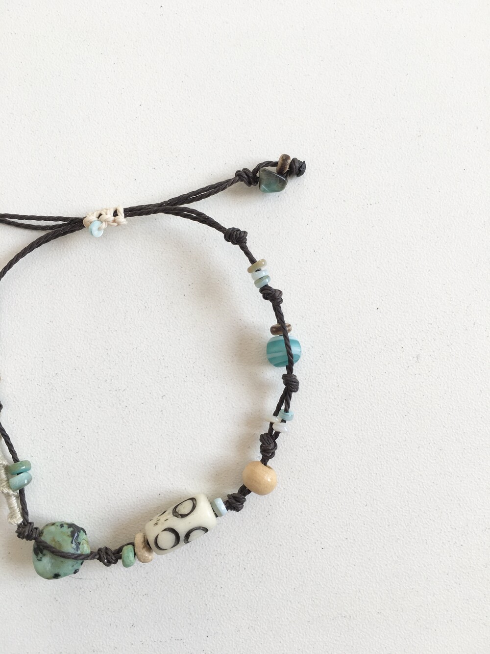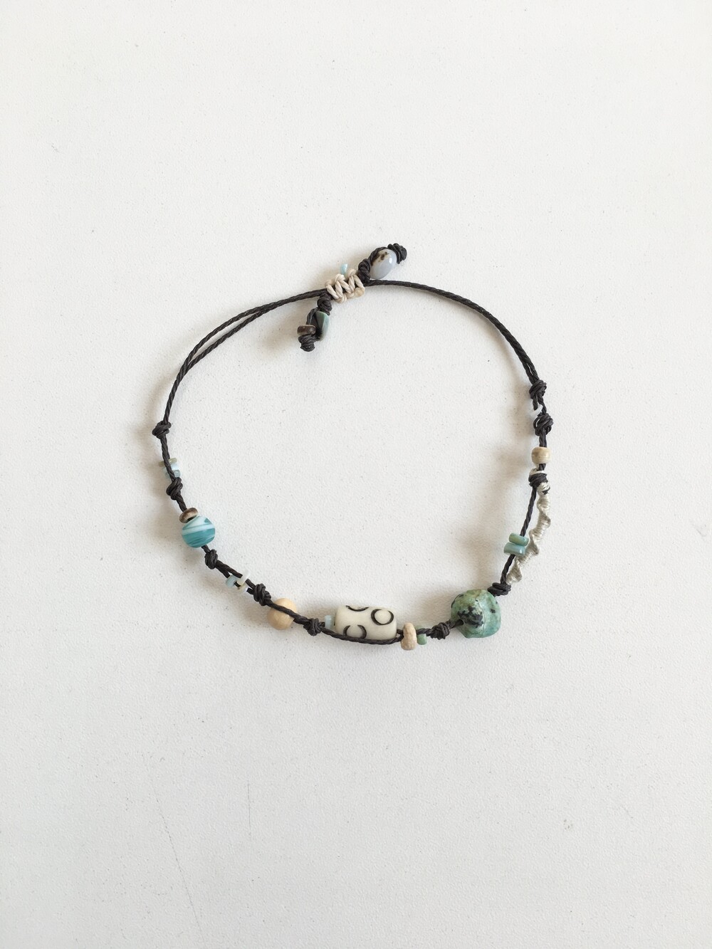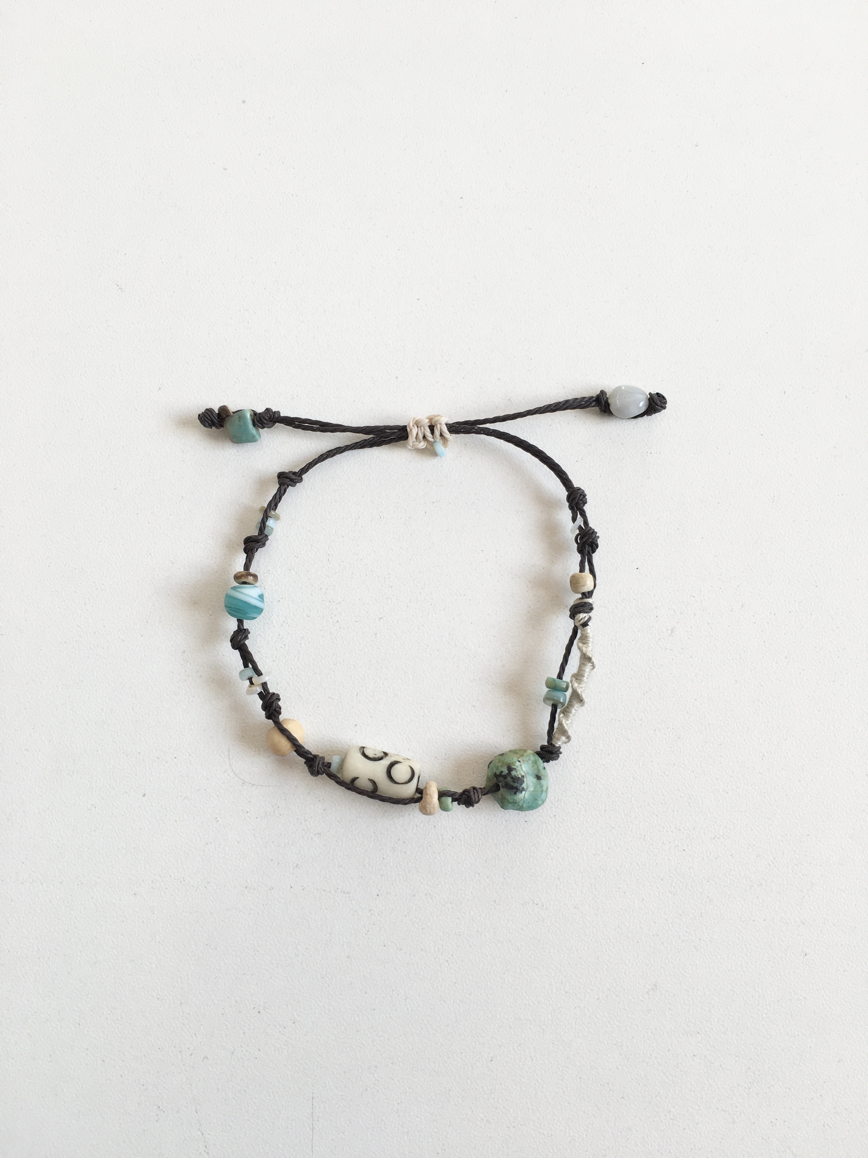 천연 원석과 우드 비즈,작은 비즈들을 매듭 사이사이에 엮어 자연스럽고 편안한 히피 무드로 완성했습니다.•.