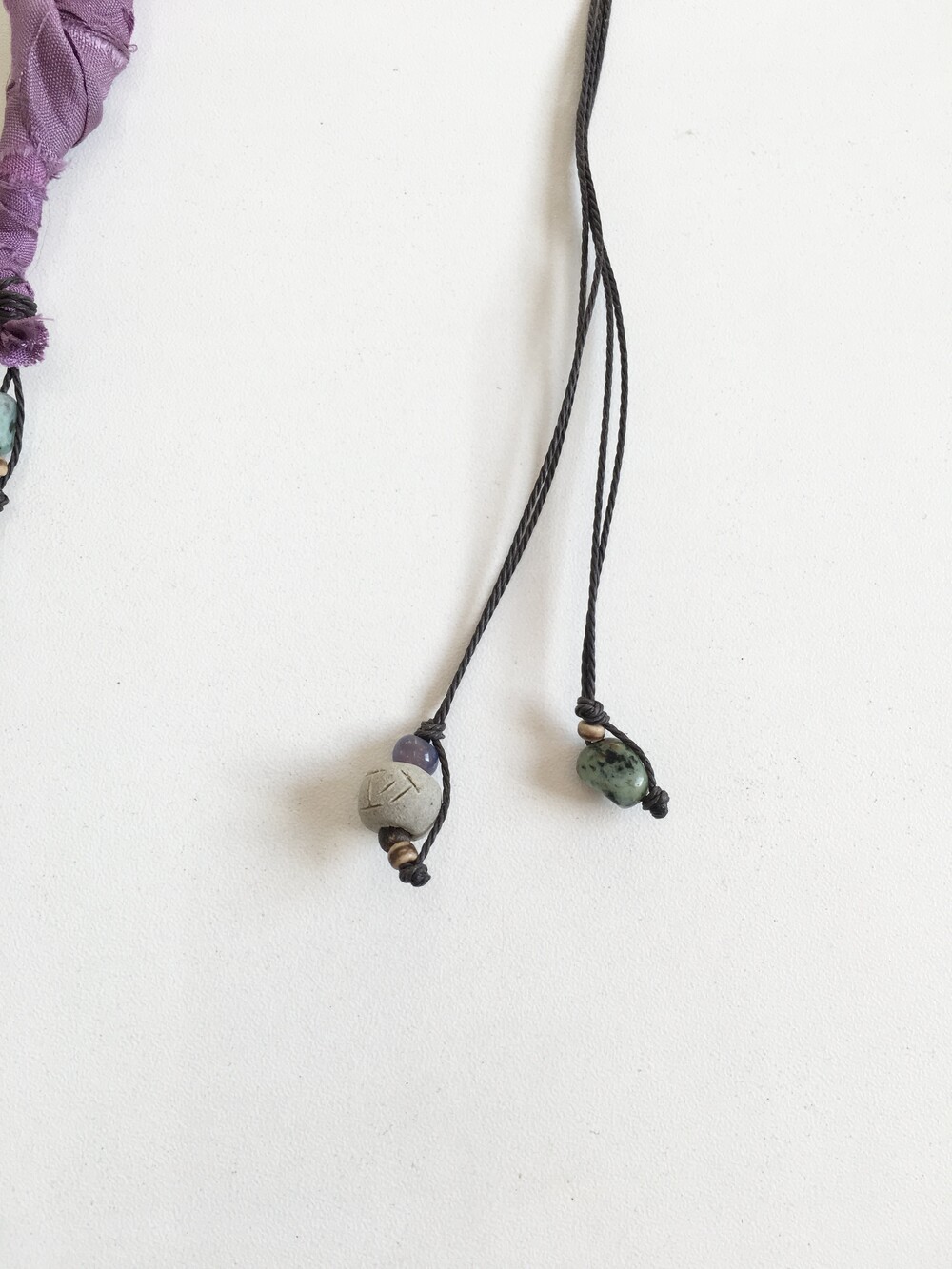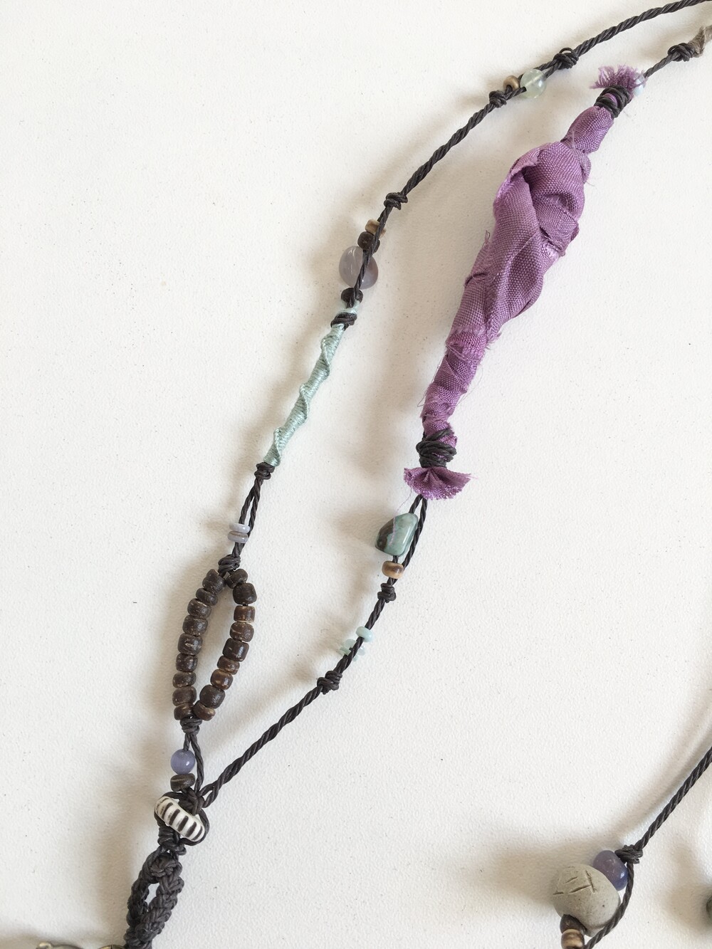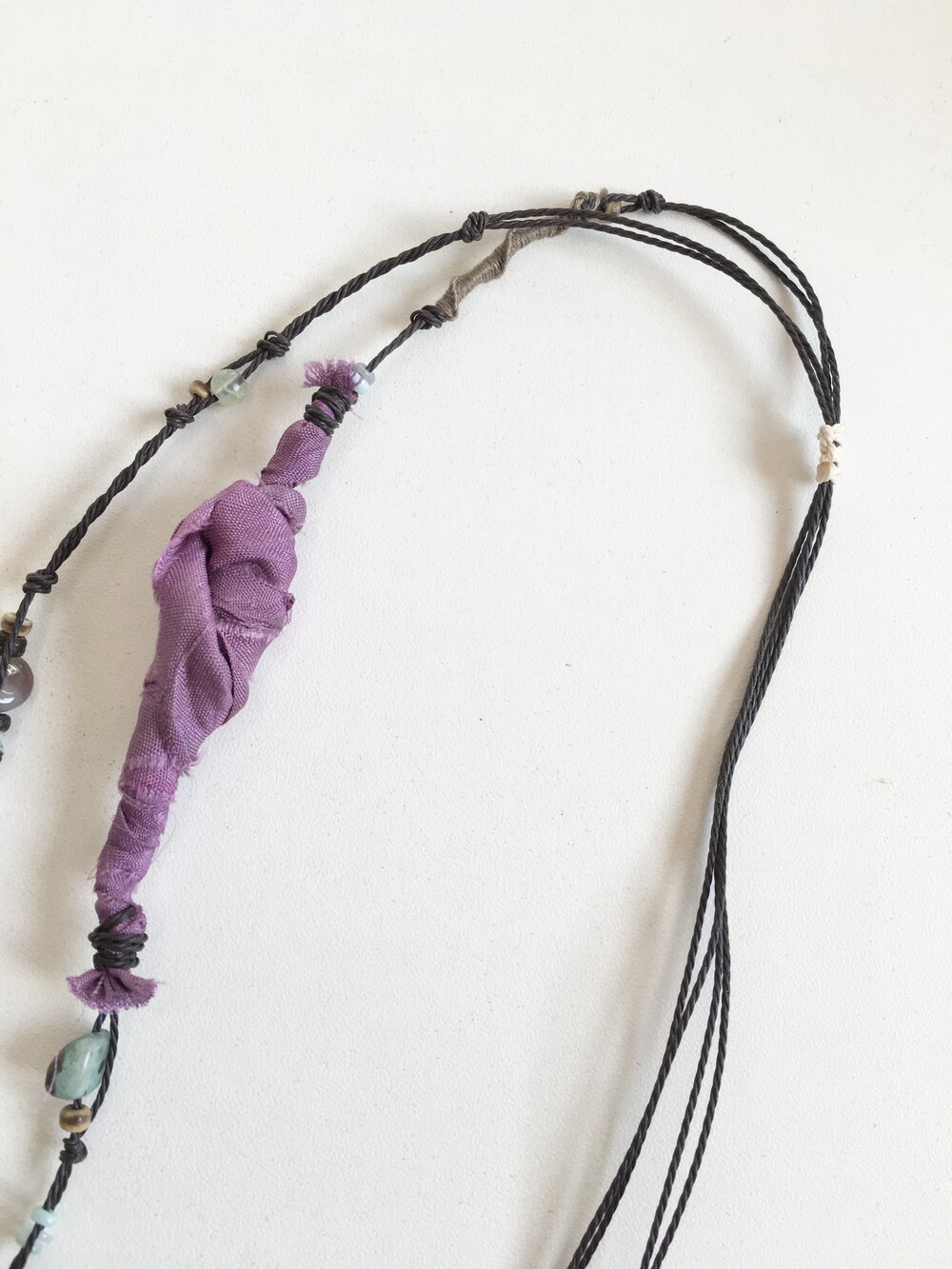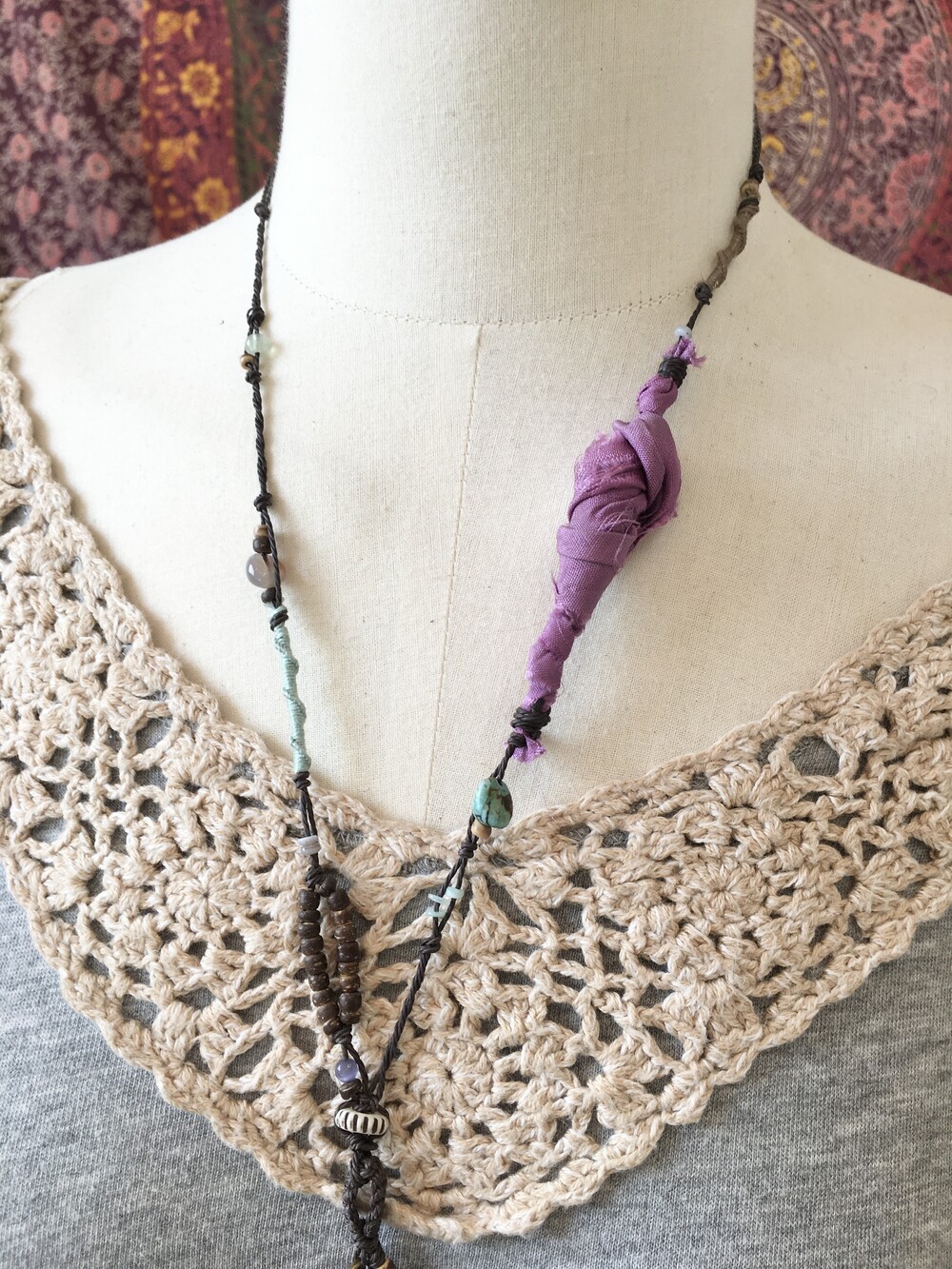 목걸이 라인에는 우드 비즈와 천연 비즈들,그리고 보라빛 패브릭을 엮어 숲속에서 주운 작은 조각들을 이어 만든 듯한