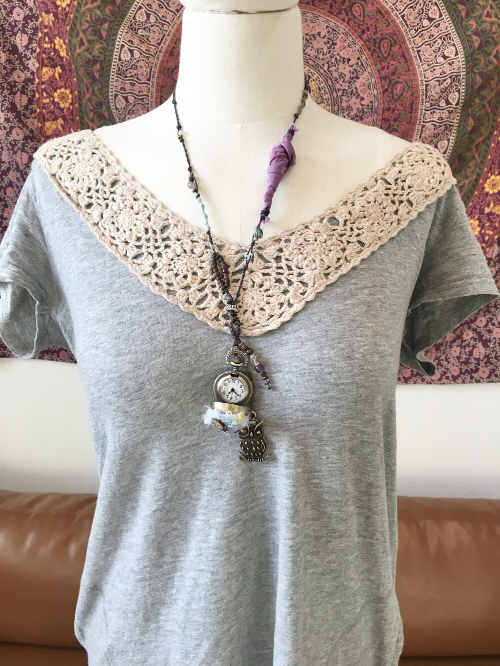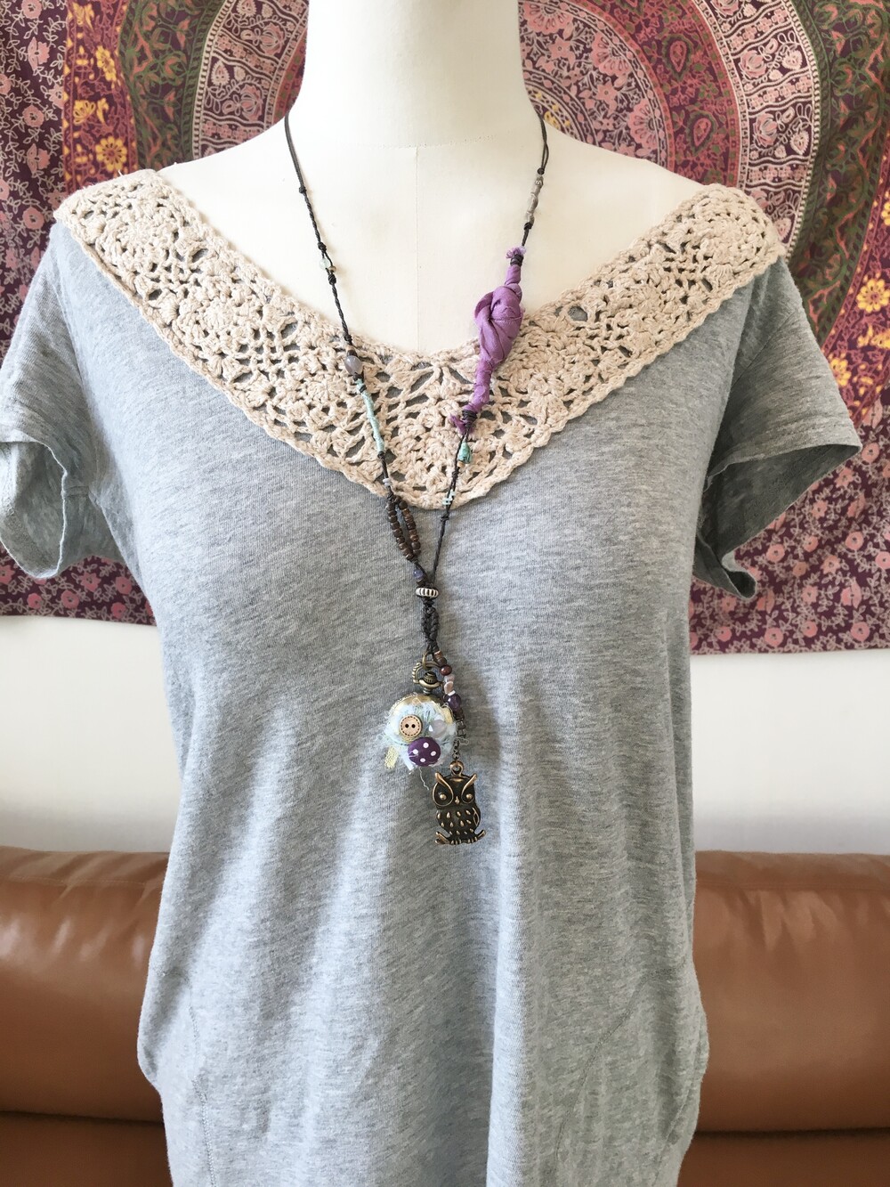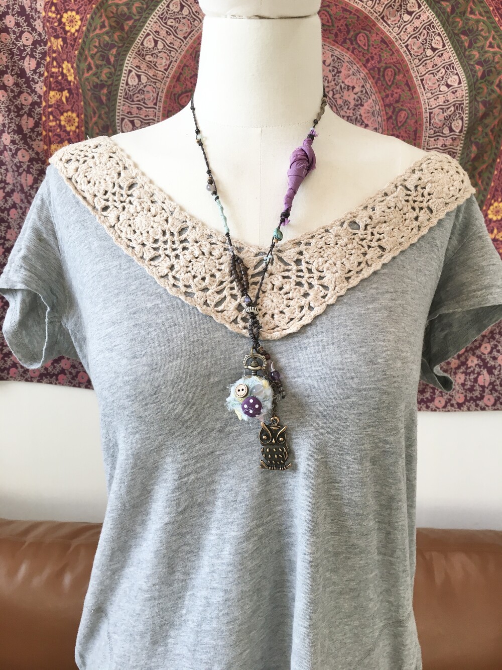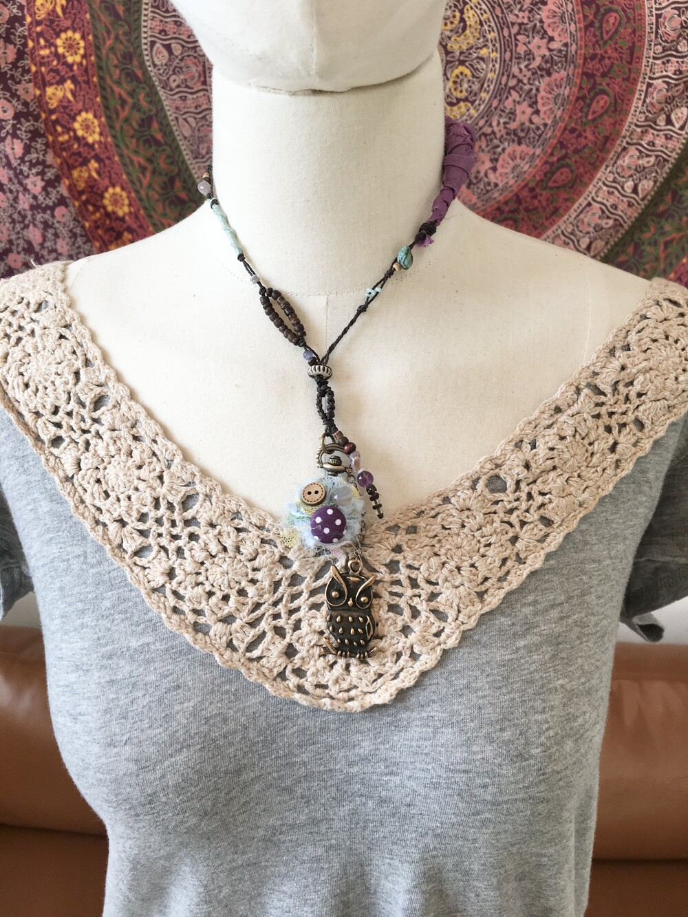 목걸이 라인에는 우드 비즈와 천연 비즈들,그리고 보라빛 패브릭을 엮어 숲속에서 주운 작은 조각들을 이어 만든 듯한