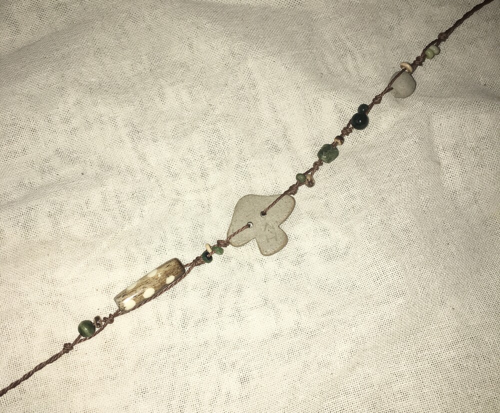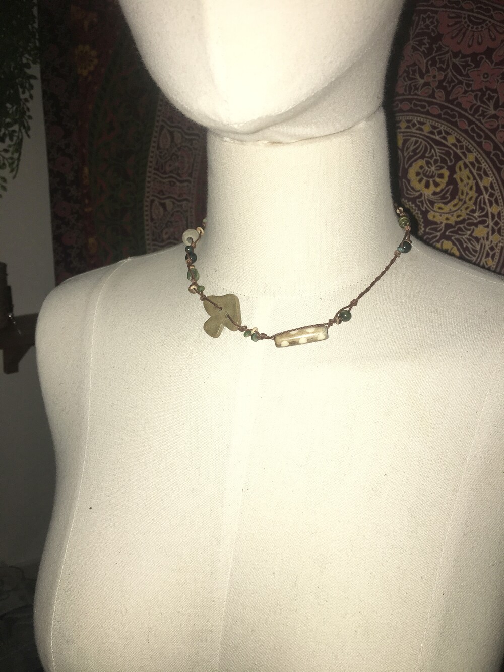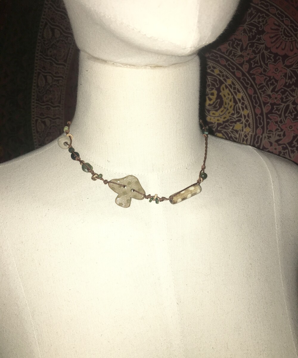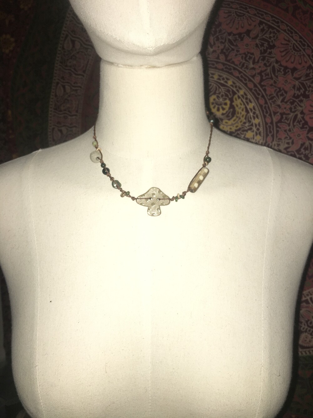 흙 고유의 색과 질감을 살려 빚은 청자토 버섯 펜던트가 중심이 되는 mushroom dot necklace 카키 버전이예요