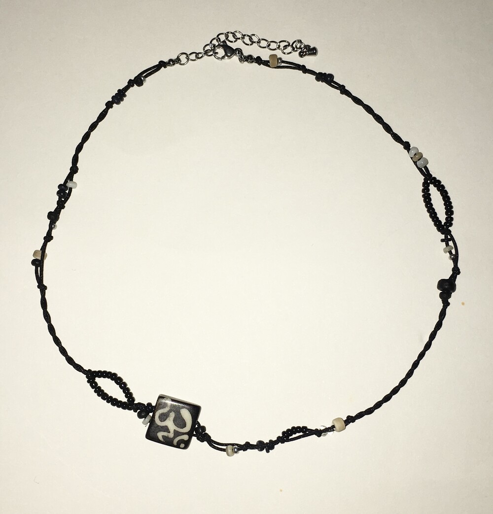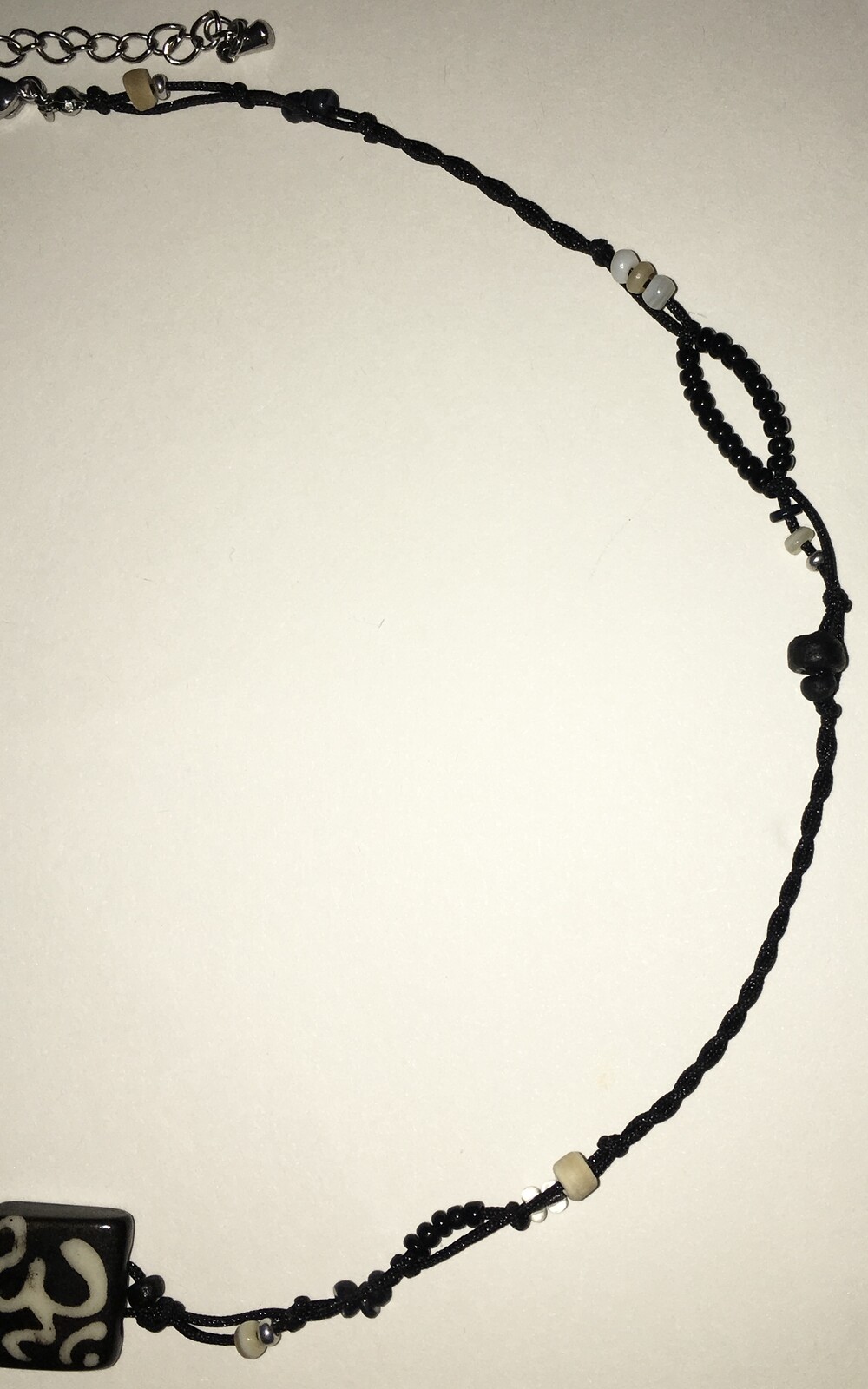 블랙 컬러의 끈을 하나하나 손으로 매듭지어 만들었고,작은 우드비즈와 자개, 블랙 컬러의 비즈들이 리듬감 있게 배치되어 있어요!