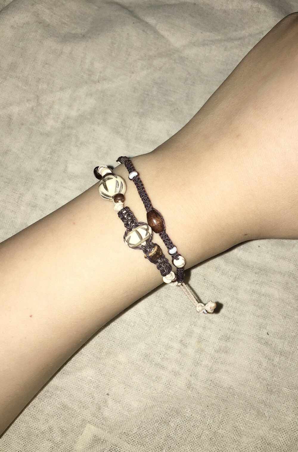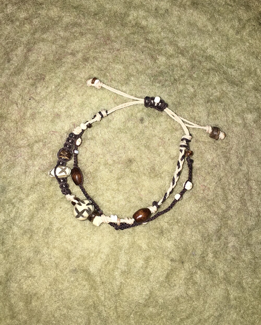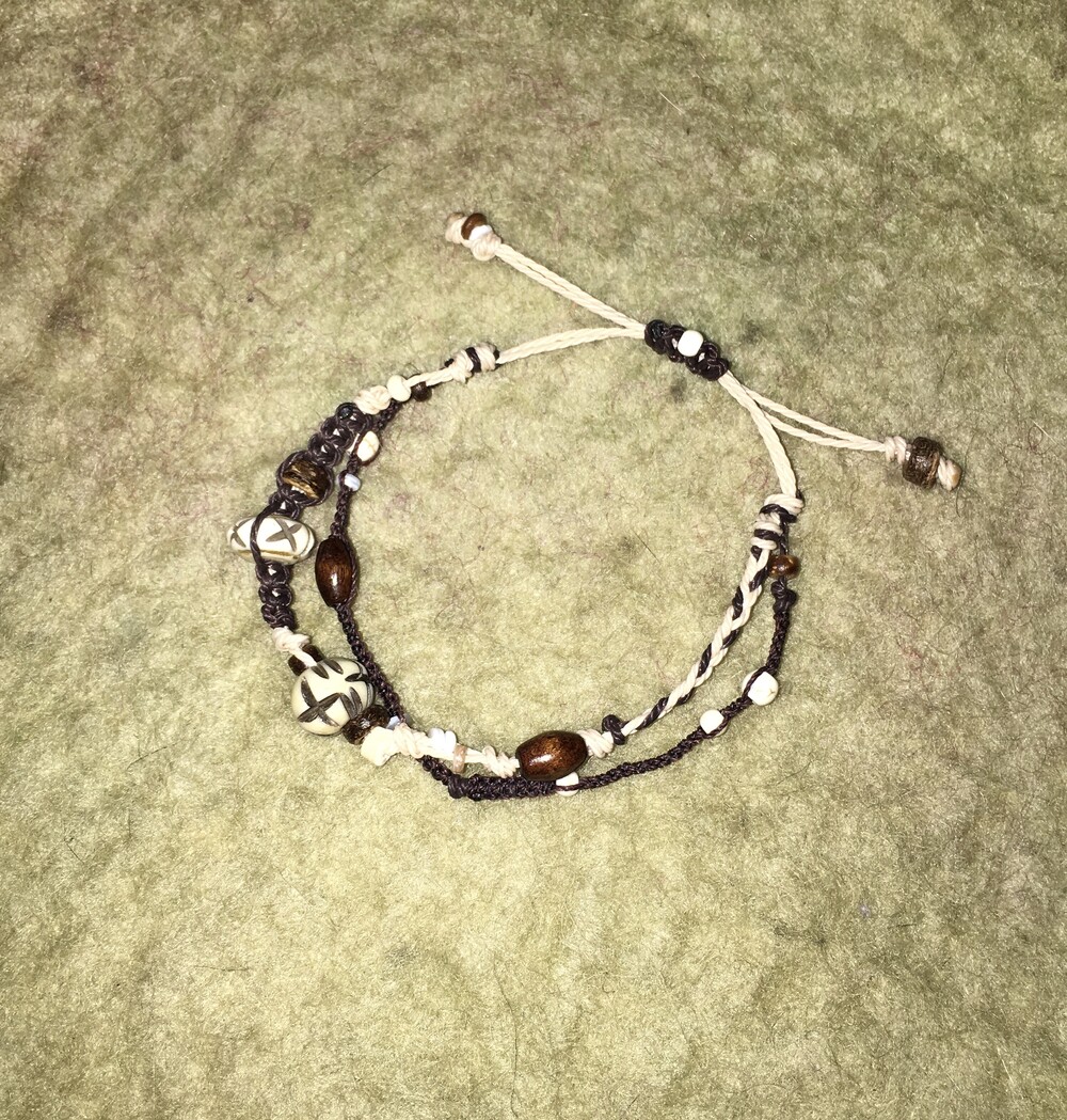 핸드카빙된 버팔로본 비즈를 중심으로, 서로 다른 매듭 라인을 두 겹으로 구성해 만든 레이어드 팔찌예요。゚•┈