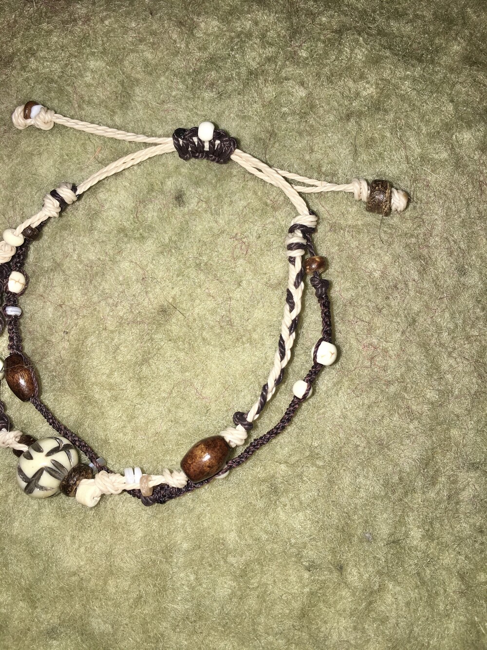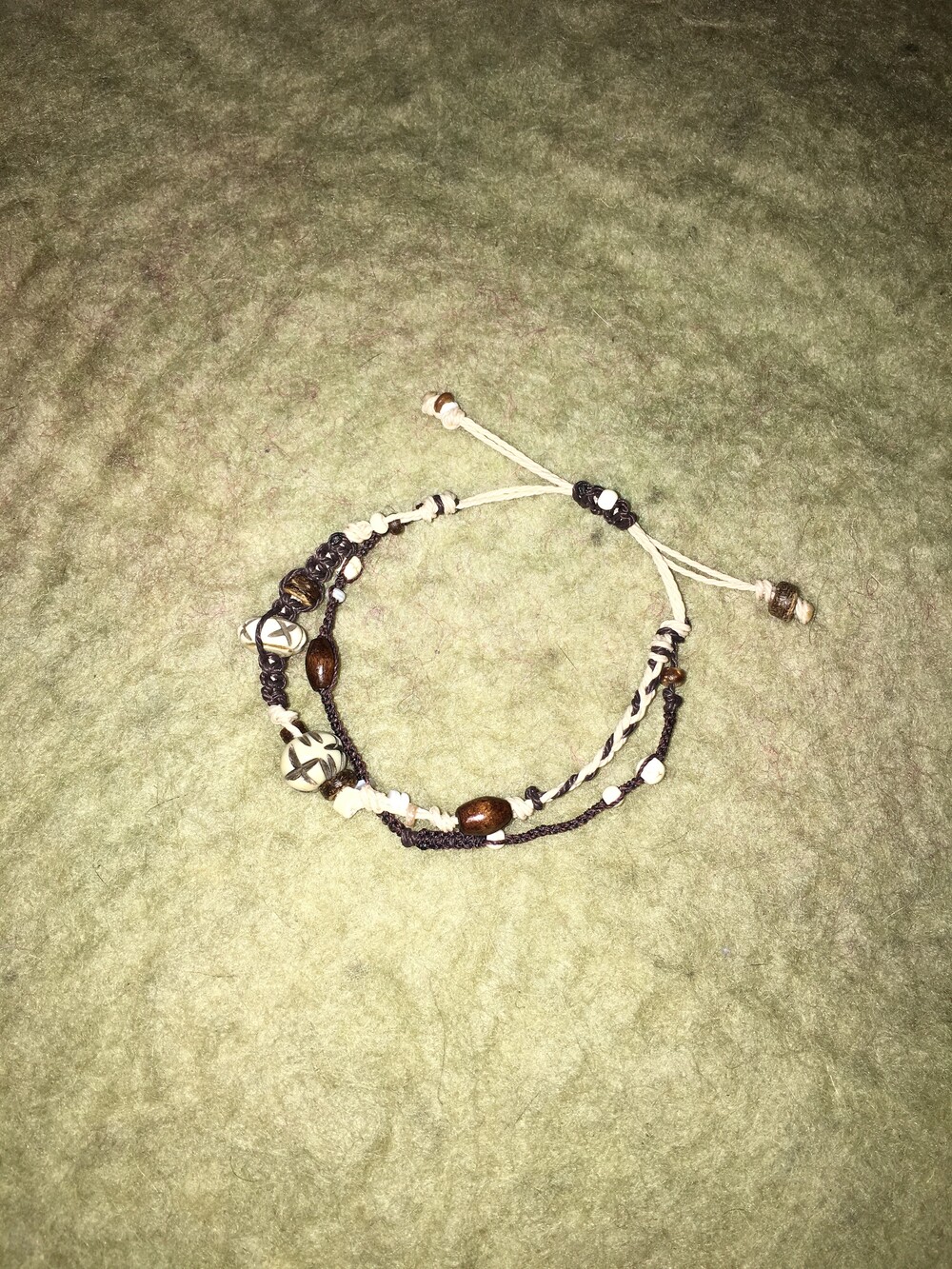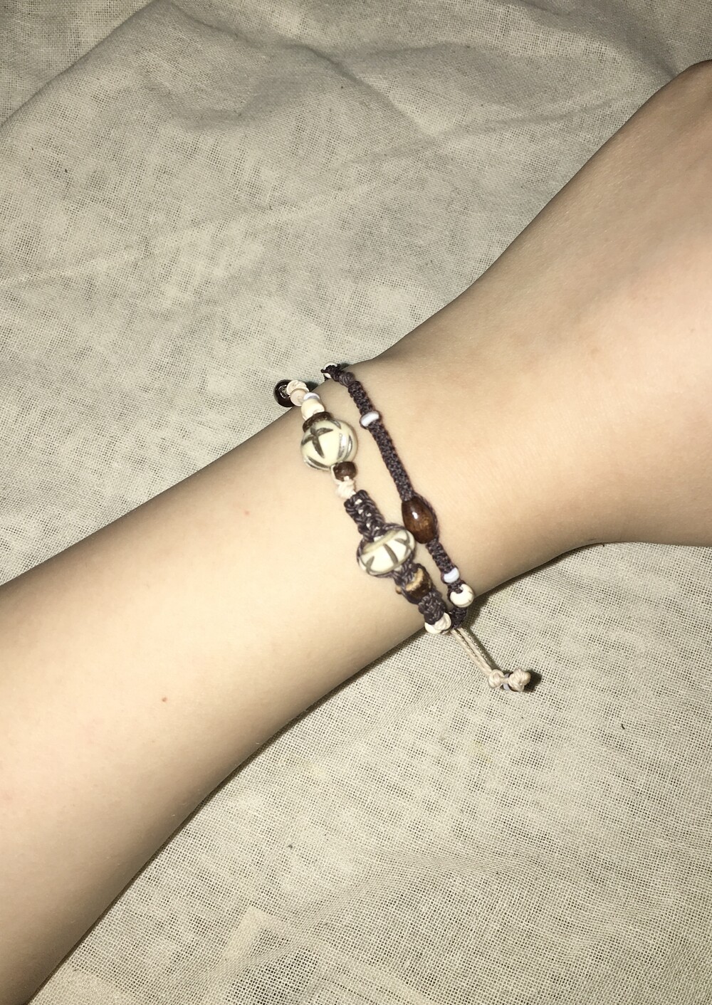 핸드카빙된 버팔로본 비즈를 중심으로, 서로 다른 매듭 라인을 두 겹으로 구성해 만든 레이어드 팔찌예요。゚•┈