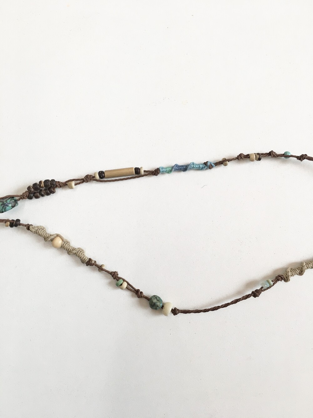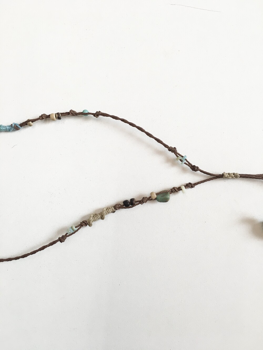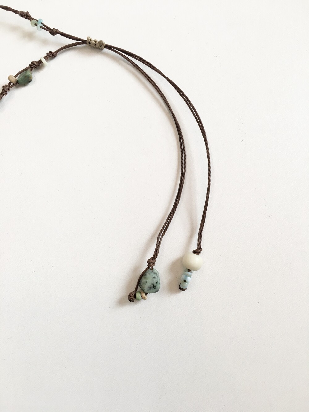 끈은 다크브라운 컬러를 베이스로 우드 비즈 · 내추럴 스톤 · 터키톤 비즈를 매듭으로 하나하나 엮어 제작했어요.•.