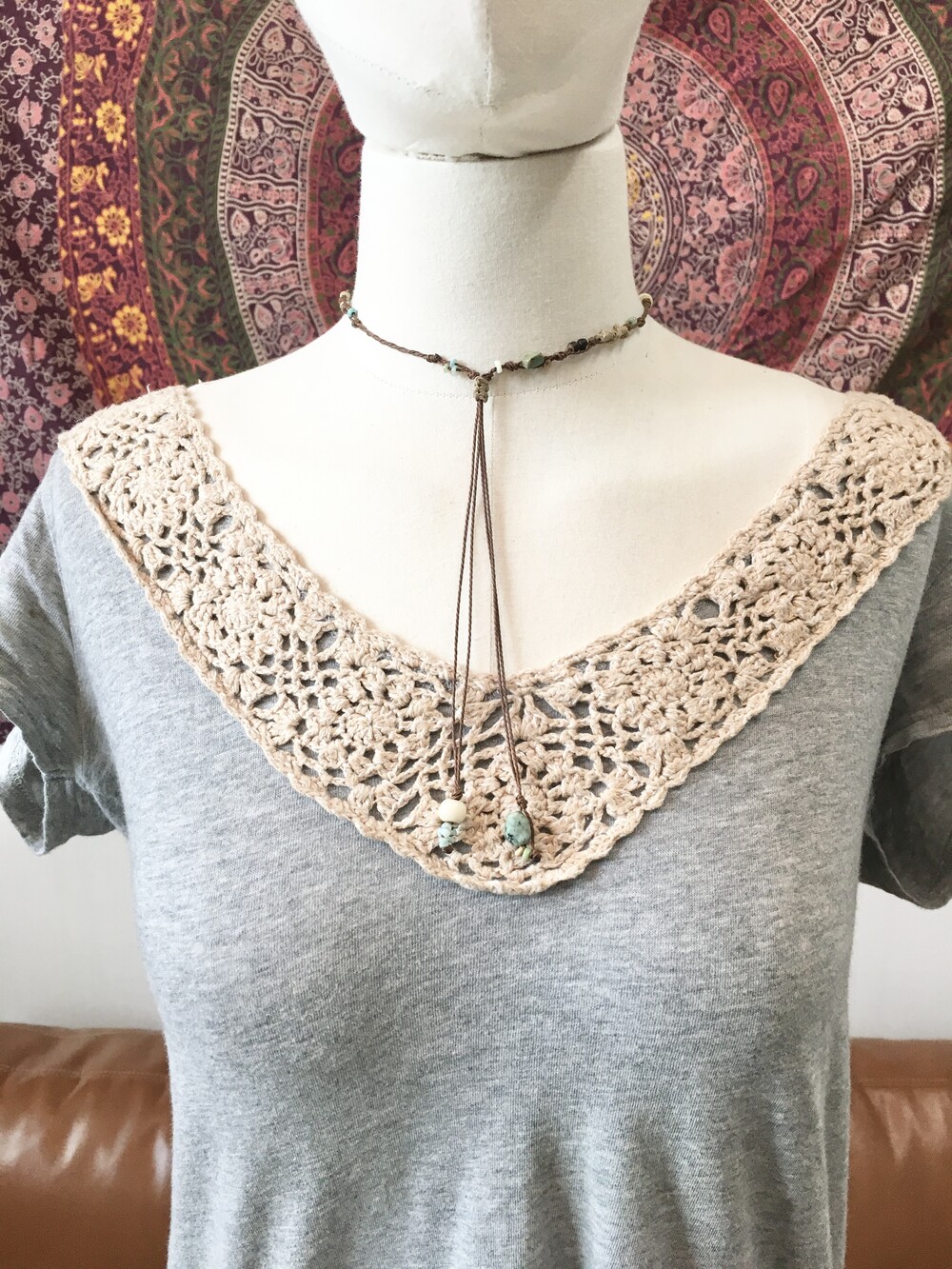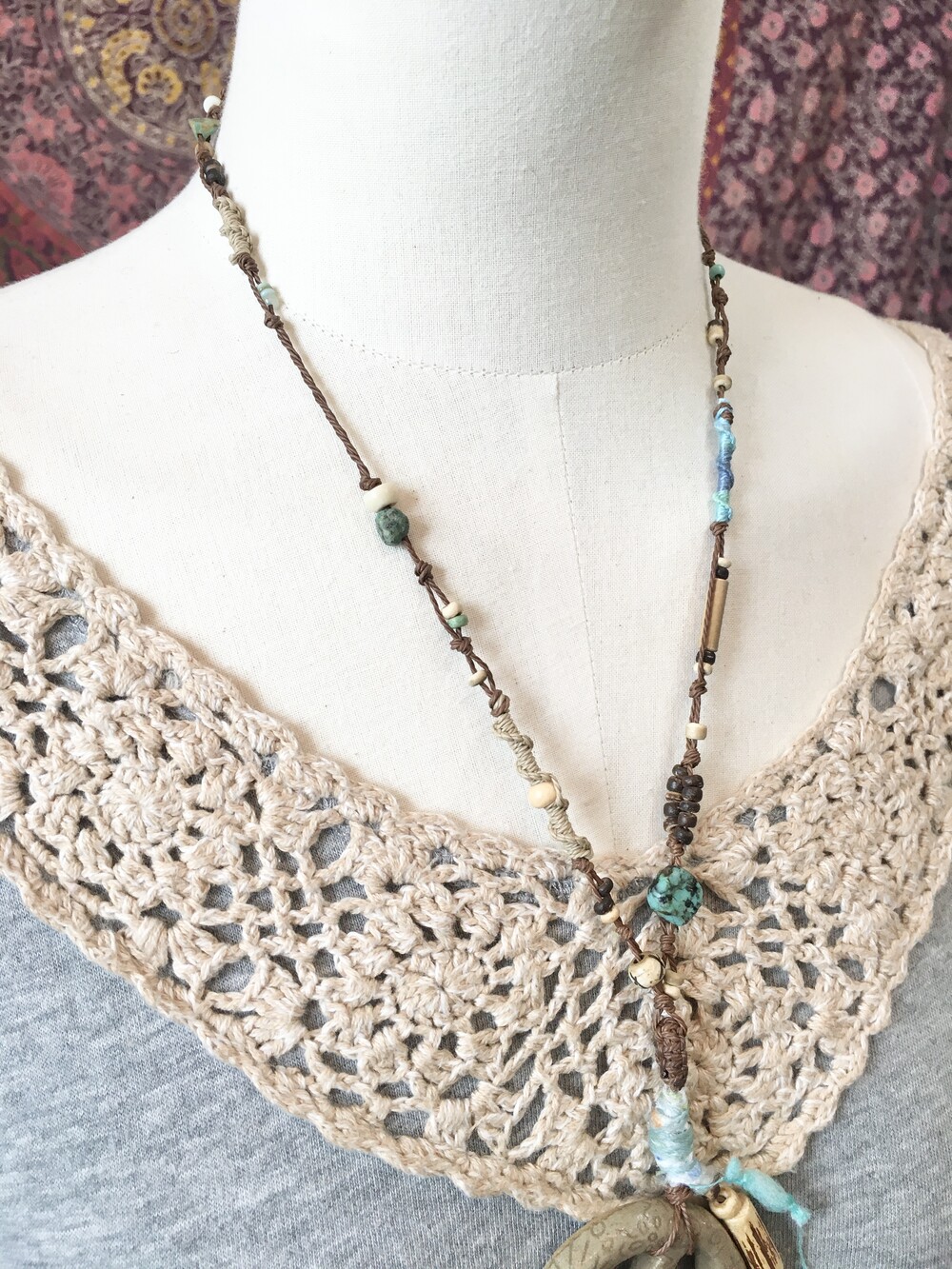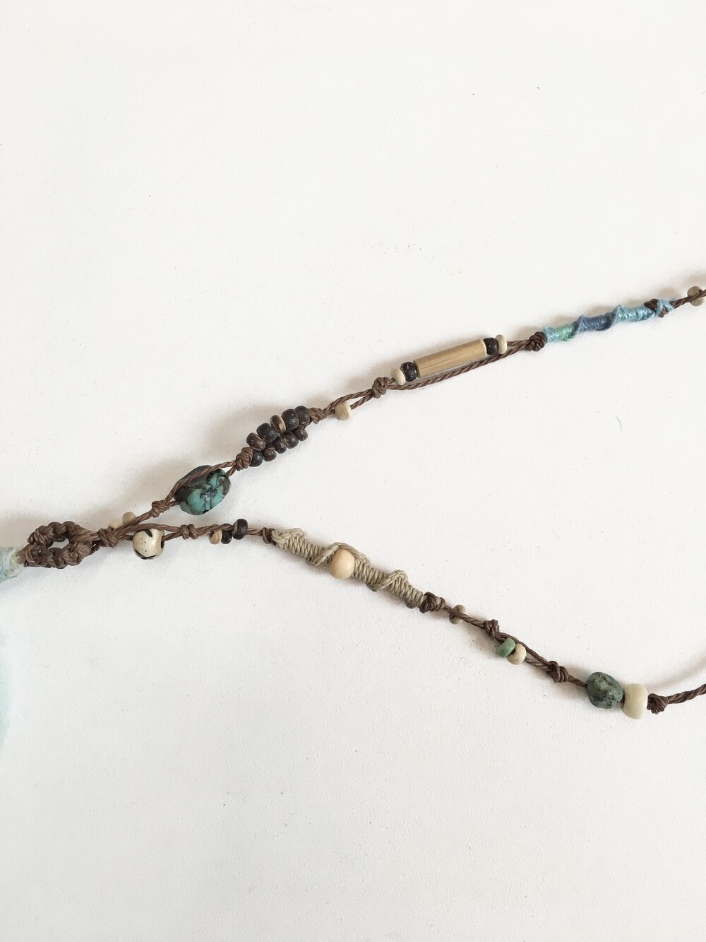 끈은 다크브라운 컬러를 베이스로 우드 비즈 · 내추럴 스톤 · 터키톤 비즈를 매듭으로 하나하나 엮어 제작했어요.•.