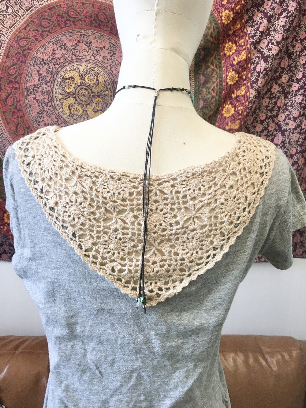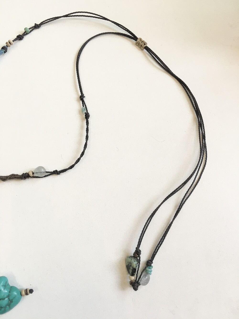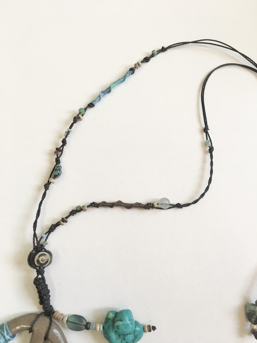 목걸이 라인은 다양한 원석과 우드 비즈, 그리고 실 감기 디테일을 더해